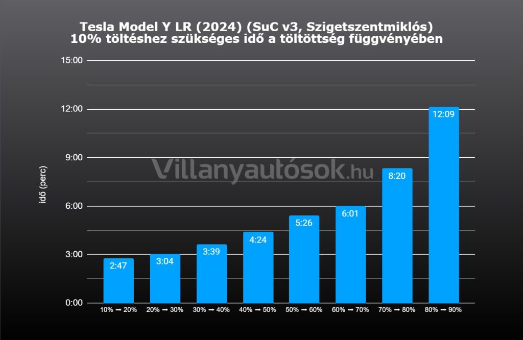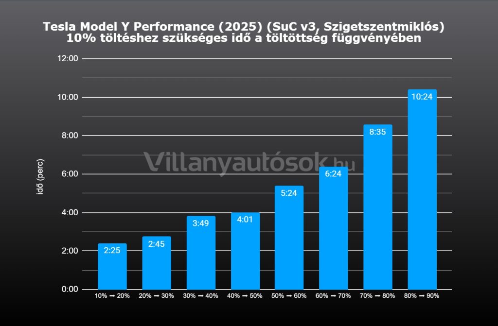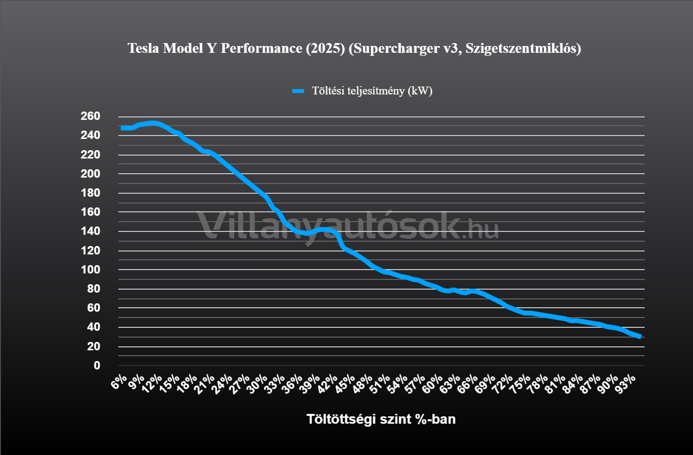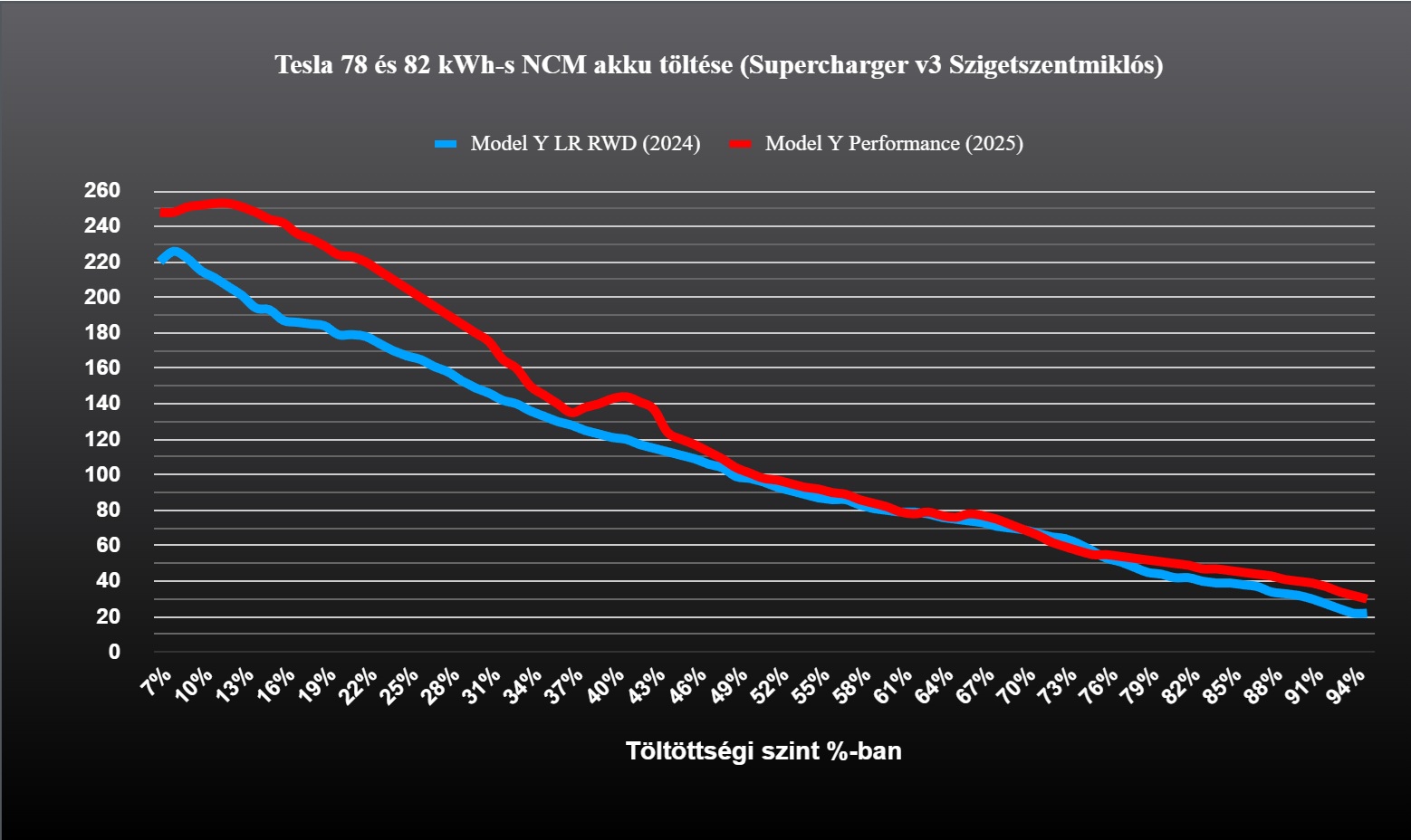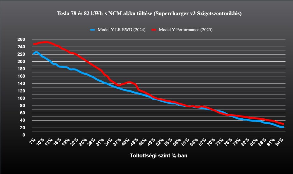 PGEgaHJlZj0iaHR0cHM6Ly93d3cua2lhLmNvbS9odS9wYnYvdmVoaWNsZXMvcHY1LWNhcmdvL2JlbXV0YXRvLz91dG1fc291cmNlPXZpbGxhbnlhdXRvc29rJnV0bV9jYW1wYWlnbj1wdjV2aWxsYW55YXV0b3NvayIgb25jbGljaz0iamF2YXNjcmlwdDp3aW5kb3cub3BlbignaHR0cHM6Ly93d3cua2lhLmNvbS9odS9wYnYvdmVoaWNsZXMvcHY1LWNhcmdvL2JlbXV0YXRvLz91dG1fc291cmNlPXZpbGxhbnlhdXRvc29rJnV0bV9jYW1wYWlnbj1wdjV2aWxsYW55YXV0b3NvaycsICdfYmxhbmsnLCAnbm9vcGVuZXInKTsgcmV0dXJuIGZhbHNlOyI+PHBpY3R1cmU+PHNvdXJjZSBzcmNzZXQ9Imh0dHBzOi8vdmlsbGFueWF1dG9zb2suaHUvd3AtY29udGVudC91cGxvYWRzLzIwMjUvMTIva2lhLXB2NS1jYXJnby1kZWMtNjAweDUwMC0yMDI1LTEyLTA4LmpwZyIgbWVkaWE9IihtYXgtd2lkdGg6IDcwMHB4KSI+PHNvdXJjZSBzcmNzZXQ9Imh0dHBzOi8vdmlsbGFueWF1dG9zb2suaHUvd3AtY29udGVudC91cGxvYWRzLzIwMjUvMTIva2lhLXB2NS1jYXJnby1kZWMtMTMwMHg2MDAtMjAyNS0xMi0wOC5qcGciIG1lZGlhPSIobWluLXdpZHRoOiA3MDBweCkiPjxpbWcgc3JjPSJodHRwczovL3ZpbGxhbnlhdXRvc29rLmh1L3dwLWNvbnRlbnQvdXBsb2Fkcy8yMDI1LzEyL2tpYS1wdjUtY2FyZ28tZGVjLTEzMDB4NjAwLTIwMjUtMTItMDguanBnIiBhbHQ9IiI+PC9waWN0dXJlPjwvYT4= Új, nagyobb kapacitású akkumulátort kaptak nemrégiben a nagy hatótávú (LR és Performance) Teslák, mi pedig kipróbáltuk, mennyivel tölt gyorsabban az új, bruttó 82 kWh-s NCM akkumulátor a réginél. Vitathatatlan a fejlődés, de azért egy picit többet vártunk… A Model Y „Juniper” frissítésének tavaszi megjelenésekor sokan reménykedtek egy új, nagyobb akkumulátorban és a kisebb, LFP akku kapacitása nőtt is egy hangyányit, de az NCM kémiás Long Range modelleket továbbra is az elődökből jól ismert 78 kWh-s akkuval szerelték. Fél évvel később végre megérkezett az új akku, elsőként a Model Y Performance változatába, majd mindegyik „nagyakkus” Model 3 és Model Y változatba. Megkapta a nagyobb akkut az utolsó európai Tesla is Az új akku töltési teljesítményéről azonban egymásnak ellentmondó információkat találtunk az interneten. Kínából jelentős javulásról számoltak be, 24 perc körüli töltési idővel kecsegtetve a 10-80% tartományban, ami a korábbi modell kicsivel 30 perc feletti töltési idejéhez képest jelentős fejlődés lett volna. Aztán megérkezett Bjørn Nyland tesztje, aki Norvégiából lehűtötte a lelkesedésünket, bizonyos körülmények között még a korábbinál is gyengébb töltési adatokról számolt be videójában. Lássuk a medvét! Ezek után kíváncsian vágtunk bele a saját töltési tesztünkbe, amihez – mindent az olvasókért – Tiborral mindketten 4:30-ra állítottuk az ébresztőt szombat hajnalban. Egyre gyakoribb a telt ház a hazai Superchargereken, és semmiképp nem szerettük volna azt, hogy a sok egy időben töltő autó miatt az oszlopok ne tudják kiszolgálni az autók maximális igényét. A teszthez két autóval vonultunk fel, az egyik az éppen nálunk lévő Tesla Model Y Performance tesztautó volt, a másik pedig a saját, 2025 márciusában átvett, de szigorúan nézve még 2024-esnek számító, Juniper frissítés előtti, 78 kWh-s LG akkuval szerelt hátsókerekes Model Y Long Range. Tudomásunk szerint a közelmúltig a Model 3 és Model Y Juniper változatok is ugyanezt az akkut kapták. Mindkét autót 5 százalékra merítettük a teszt kezdetéhez. Szigetszentmiklóson úgy sikerült töltőoszlopot foglalni, hogy az egyik autó a 4A-4D sorozatú oszlopokon, a másik az 5A-5D sorban egyedül legyen – ezúton is köszi a márkatársnak, aki kérésünkre azonnal másik oszlophoz állt. Az akku megfelelő hőmérsékletéről a Budapestről induló régi Tesla esetén az előfűtés és rövid fóti bemelegítő-töltés gondoskodott. Az új Tesla Miskolcról indult az autópályán, és meglepő módon az út során egyszer sem írta, hogy fűtené az akkut. Korábbi tapasztalataink szerint 200 km autópályázás nem elég az akku felmelegítéséhez, ezért a Superchargerhez közeledve igyekeztem néhány dinamikus gyorsítással és lassítással emelni az akku hőmérsékletét. Hogy erre szükség volt-e, sosem tudjuk meg. A lényeg, hogy az új autó akkuja is biztosan elég meleg lett, különben nem láttunk volna a képernyőn 250 kW fölötti értékeket. Elképzelhető, hogy az új akku gyors töltéséhez kevésbé kritikus a hőmérséklet. A képzeletbeli startpisztoly 7:05-kor dördült el, és kezdetét vette az izgalmas töltési verseny. Már az első percekben úgy tűnt, hogy a meccs eldőlt: az új autó töltési teljesítménye egészen 253 kW-ig szaladt fel, miközben a régi csak 226 kW-os maximumot ért el egy pillanatra, ráadásul az alapos felkészülés ellenére a régi autóban bekapcsolva maradt az utastér fűtés is a töltés elején, elképzelhető tehát, hogy 1-2 kW-tal kevesebb ment az akkuba. A kezdeti nagyobb csúcsteljesítmény egyértelműen megjelent a töltési időben is: az új autó 15 perc alatt érte el 5%-ról indítva az 50%-os töltöttségi szintet, a töltőoszlopból ezalatt 37 kWh-t kiszippantva. Ugyanekkor a régi autó még csak 48%-on járt, 33 kWh energiát felhasználva. A 2 százalékos különbség tartósnak bizonyult: 20 perc alatt az új autó 60%-ig, a régi 58 százalékig jutott. Itt azonban már egymásra simult a két autó töltési görbéje, gyakorlatilag azonos teljesítménnyel töltött mindkét autó, ezért a régi autó elkezdte ledolgozni a lemaradását. Itt érdemes megemlíteni, hogy egy 800 voltos versenytárs ennyi idő alatt már elérte volna a 80 százalékos szintet, igaz, ezeket az adatokat a fogyasztást is figyelembe véve érdemes elemezni, hiszen az autósoknak nem az a fontos, hogy mennyi idő szükséges a 80%-os töltöttség eléréséhez, sokkal inkább az, hogy ha 200 km van hátra a célig (vagy a következő töltőig), akkor mennyi ideig kell tölteni. 80%-os szintnél már 1 perc sem volt a különbség. A régi autó 35, az új 34,5 perc alatt érte el ezt a mérföldkövet. Fontos persze, hogy az új Tesla 62 kWh-t, míg a régi csak 57 kWh-t fogadott az oszloptól, tehát azonos id