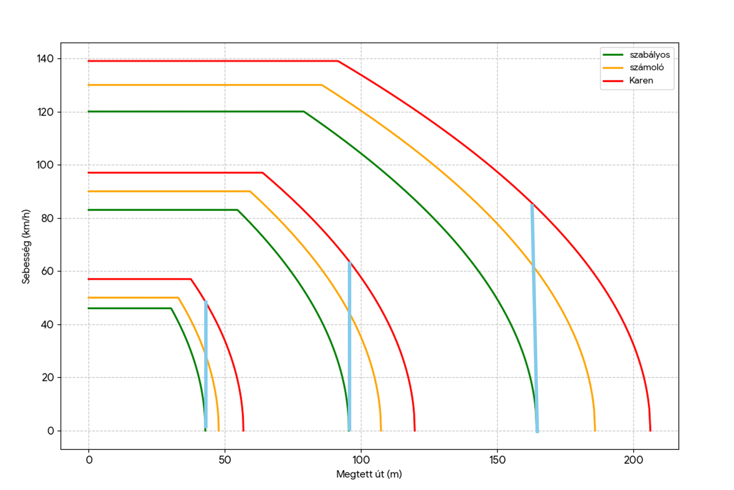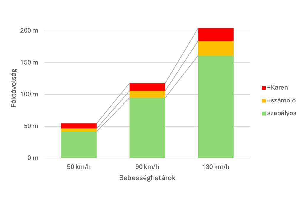 A gyorshajtás a közúti közlekedés egyik leggyakrabban előforduló szabályszegése, amelynek társadalmi veszélyessége messze túlmutat a puszta jogsértés tényén. A járművezetők jelentős része úgy tekint a sebességhatárok átlépésére, mint „tolerálható” magatartásra, amely sokszor csupán adminisztratív kockázatot hordoz magában. Széles körben elterjedt a szemlélet, hogy a rendőrségi sebességmérő eszközök hibahatára adja meg azt a „láthatatlan tartományt”, amelyben a gyorshajtás még büntetlenül marad. Ezzel a gondolkodásmóddal azonban a közlekedők figyelmen kívül hagyják a sebesség közlekedésbiztonsági relevanciáját és a fizikai törvényszerűségeket. A gyorshajtás során a megnövekedett fékút, a reakcióidőből fakadó késedelmes beavatkozás, valamint az ütközéskori mozgási energia négyzetes növekedése mind olyan tényezők, amelyek drasztikusan rontják a balesetek kimenetelének esélyeit. A nagyobb sebesség nem csupán a járművezetőre ró fokozott terhet a jármű irányításában, hanem a közlekedés többi résztvevőjét is közvetlen kockázatnak teszi ki. E kockázat különösen érzékenyen érinti a védtelen közlekedőket – gyalogosokat, kerékpárosokat –, akik számára a gépjárművek gyorshajtásának következményei gyakran végzetesek. A sebességtúllépés tehát nem egyéni „időnyereség”, hanem olyan magatartásforma, amely szisztematikusan csökkenti a közlekedés biztonsági szintjét, és hozzájárul a közúti közlekedésben tapasztalható baleseti mutatók kedvezőtlen alakulásához. Jelen cikkel nem célom elítélni a gyorshajtókat, sem a GPS-szel mért sebességhatáron való utazást – csupán gondolatébresztőnek szánom. A gépjárművezetők többsége úgy vélekedik, hogy egy kisebb gyorshajtással legfeljebb neki annyi a feladata, hogy jobban oda kell figyelnie, és legfeljebb egy picikét hosszabb lesz a féktávolság. Szinte alig van olyan ember, aki leül egy üres papírlap mellé, kezében egy tollal, és a számok illetve a tények ismeretében, egy kis matematikai és fizikai ismeretet alapul véve elvégez pár számítást, hogy mi is a valós következménye a gyorshajtásnak. De én most vettem az időt és a fáradságot, internetes kutatást végeztem, és magam is meglepődtem a kapott eredményeken. A tényleges eredmények ismertetése előtt nézzünk egy kicsit az elméletbe. Valószínűleg mindenki emlékszik még arra gépjármű vezetői tanulási idejéből, hogy a féktávolság kettő fő összetevőből áll: a reakcióidő alatt megtett távolságból (egyes irodalmak szerint reakció távolságból), és a fékútból. A reakció idő az alábbi időkomponensekből áll: az információ eljutása az agykéregbe (0,034 s) az inger érzékelése és feldolgozása, azaz felismerési idő (0,151-0,312 s) a helyes döntés meghozatala, mozgásindítási idő (0,295-0,724 s) cselekvési idő a pedálreakció idővel együtt (0,7-1,3 s) Így a reakcióidő egy vezetésre figyelő, nem defenzív, átlagos személy esetében 1,18-2,37 másodperc. Ezen idő alatt a jármű lényegesen nem lassul, csak amennyit már a tényleges cselekvési idő megkezdte után a menetszél, a motorfék, vagy elektromos jármű esetén a regeneratív rendszer lassít rajta. A gépjármű fékezés közbeni lassulása több tényezőtől is függ: a gumiabroncs és az út közötti tapadási együtthatótól, a gépjármű tömegétől, valamint a fékrendszer erősségétől. (Itt meg kell említeni, hogy az elméleti számítások esetében a tapadási együttható vizsgálatakor elégséges lenne csak a gumi és az aszfalt közötti elméleti értéket figyelembe venni. Azonban a gumiabroncs elaszticitása és a felület egyenetlensége miatt a gumiabroncs belső szerkezete és méretei is befolyásolják ezt a tényleges tapadási értéket, de most itt ebbe nem merülök bele.) Mindezek figyelembevételével száraz, jó minőségű útfelületen egy hagyományos , ABS-szel felszerelt személygépkocsi átlagos lassulásának vehető a 6,5 m/s2 érték. Lássuk hát, hogy mik jöttek ki eredményként: Műszer szerinti sebesség* (km/h) Tényleges (GPS) sebesség (km/h) Reakció távolság (m) Fékút (m) Féktávolság (m) 50 46 15-30 12 27-42 90 83 27-54 41 68-95 130 120 39-76 85 124-161 *: Ezen érték azon járművekre vonatkozik, amelyekben a belső műszer szerint kijelzett sebesség nem GPS-szerinti adat. Ezt a fenti táblázatot nem kívánom elemezni, de elméletekben nem jártasoknak egy fontos információt nyújt: a sebesség emelkedésével nem arányosan, hanem négyzetesen nő a fékút hossza. Ez azért van, mert fékezéskor a kinetikus (mozgási) energiát kell más (főként súrlódási) energiává alakítani, és a kinetikus energia pedig az Ek=1/2 mv2 (ahol m [kg] a mozgó tömeg, v [m/s] pedig a sebesség) képlettel számolható. A fontosabb viszont, amire ki szeretnék térni, az a táblázat első kettő oszlopa miatt egyesekben megébredő okoskodási vágy: „a műszer mindig többet mutat, annál nyugodtan mehetek gyorsabban…” Ennek az az alapja, hogy a közúti járművek forgalomba helyezésének és forgalomban tartásának műszaki feltételeiről szóló a 6/1990. (IV. 12.) KöHÉM rendelet 92. § (1) alapján „a sebességmérő a jármű tényleges sebességénél — 20 km/h sebesség felett — kisebb értéket nem mutathat”. Mivel a különböző gumiabroncs méretek, a kopottság és a keréknyomás miatt a féltengely fordulatszáma és a tényleges sebesség között nem állandó az arány egy jármű esetében, így műszereket úgy kalibrálják, hogy többet mutasson a tényleges sebességnél. Ez arra ösztönzi a (Werhner von Braun és Szergej Pavlovics Koroljov képességeit megszégyenítő számolási képességekkel bíró) „rakétamérnök” gépjárművezetőket, hogy azon