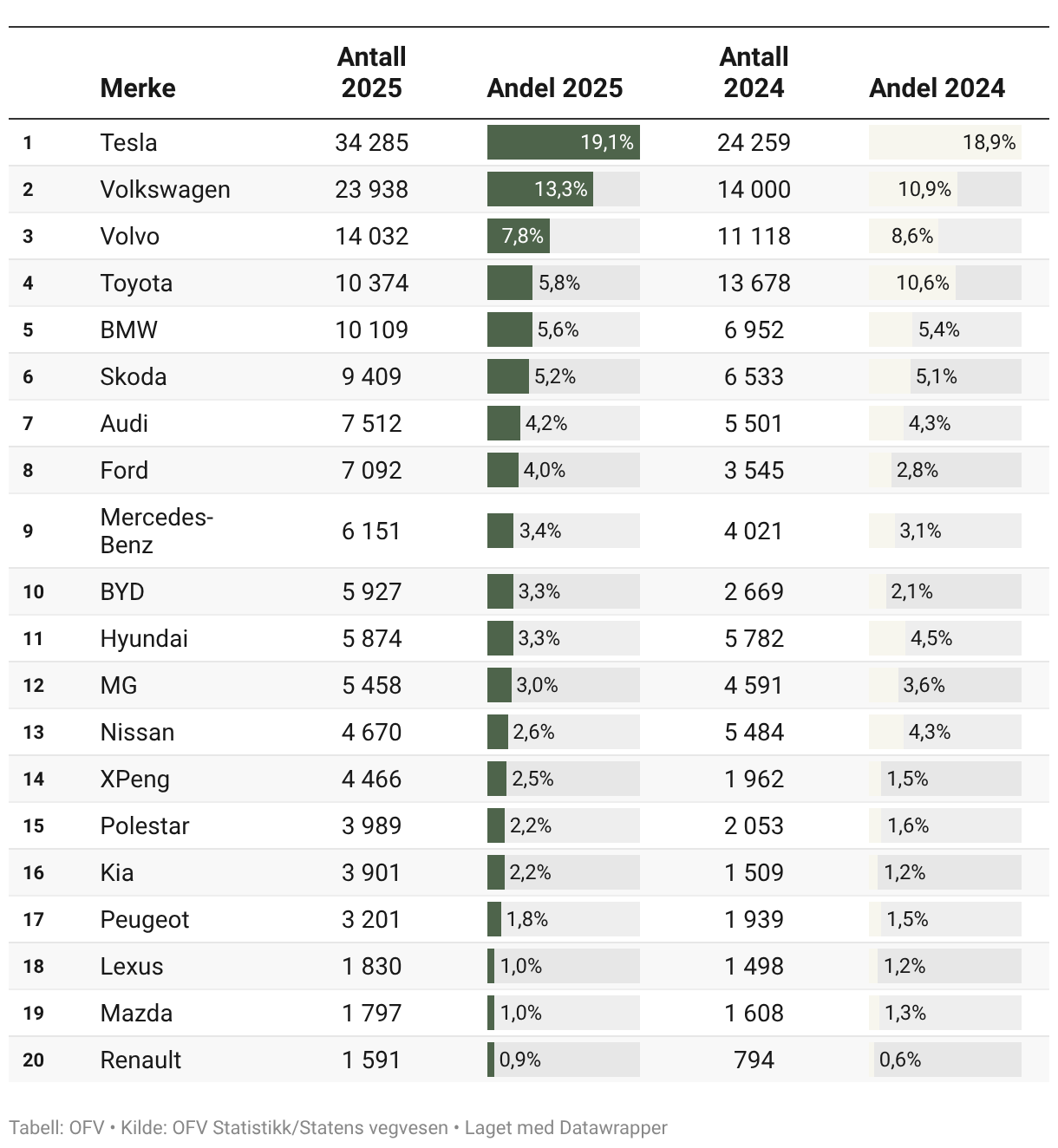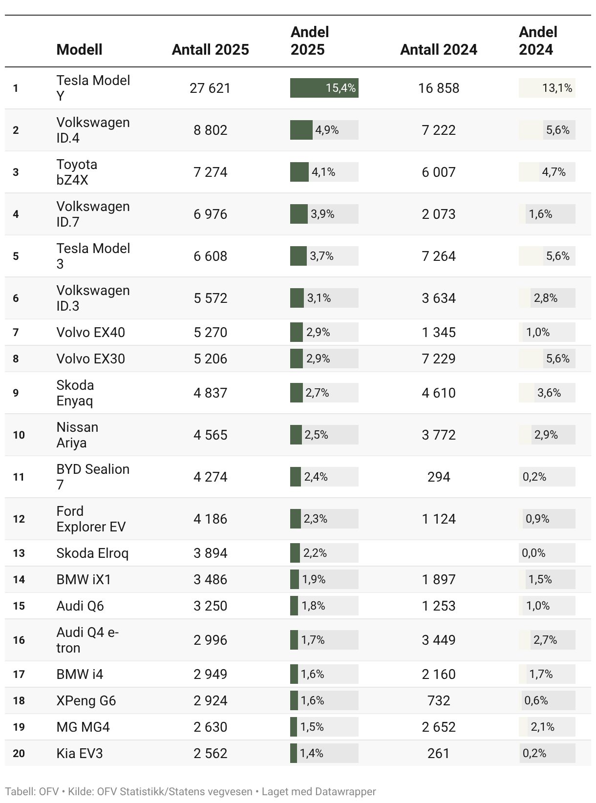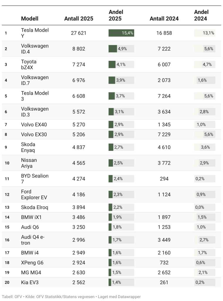 Norvégia régóta a villanyautózás éltanulója, ám a tavalyi eredmény még ezzel a mércével mérve is elképesztő. De vajon idén fordulhat a kocka?PGEgaHJlZj0iaHR0cHM6Ly9hZC5kb3VibGVjbGljay5uZXQvZGRtL3RyYWNrY2xrL04xMDAzMDU1LjQxODI1ODBPVEgtVklMTEFVLVJPUy1NL0IzNDgxODEzMS40MzYzMDc2NTY7ZGNfdHJrX2FpZD02Mjk0MjU4NTk7ZGNfdHJrX2NpZD0yNDY4ODM2NTc7ZGNfbGF0PTtkY19yZGlkPTt0YWdfZm9yX2NoaWxkX2RpcmVjdGVkX3RyZWF0bWVudD07dGZ1YT07Z2Rwcj0kR0RQUjtnZHByX2NvbnNlbnQ9JEdEUFJfQ09OU0VOVF83NTU7bHRkPTtkY190ZHY9MSIgb25jbGljaz0iamF2YXNjcmlwdDp3aW5kb3cub3BlbignaHR0cHM6Ly9hZC5kb3VibGVjbGljay5uZXQvZGRtL3RyYWNrY2xrL04xMDAzMDU1LjQxODI1ODBPVEgtVklMTEFVLVJPUy1NL0IzNDgxODEzMS40MzYzMDc2NTY7ZGNfdHJrX2FpZD02Mjk0MjU4NTk7ZGNfdHJrX2NpZD0yNDY4ODM2NTc7ZGNfbGF0PTtkY19yZGlkPTt0YWdfZm9yX2NoaWxkX2RpcmVjdGVkX3RyZWF0bWVudD07dGZ1YT07Z2Rwcj0kR0RQUjtnZHByX2NvbnNlbnQ9JEdEUFJfQ09OU0VOVF83NTU7bHRkPTtkY190ZHY9MScsICdfYmxhbmsnLCAnbm9vcGVuZXInKTsgcmV0dXJuIGZhbHNlOyI+PHBpY3R1cmU+PHNvdXJjZSBzcmNzZXQ9Imh0dHBzOi8vdmlsbGFueWF1dG9zb2suaHUvd3AtY29udGVudC91cGxvYWRzLzIwMjUvMTIvY3V0b3V0LXBvdGxhcy1tYi1zdXYtMTQwLXllYXJzLXJvcy0xMjAweDE2MDAtaHUuanBnIiBtZWRpYT0iKG1pbi13aWR0aDogNzAwcHgpIj48aW1nIHNyYz0iaHR0cHM6Ly92aWxsYW55YXV0b3Nvay5odS93cC1jb250ZW50L3VwbG9hZHMvMjAyNS8xMi9jdXRvdXQtcG90bGFzLW1iLXN1di0xNDAteWVhcnMtcm9zLTEyMDB4MTYwMC1odS5qcGciIGFsdD0iIj48L3BpY3R1cmU+PC9hPjxJRlJBTUUgU1JDPSJodHRwczovL2FkLmRvdWJsZWNsaWNrLm5ldC9kZG0vdHJhY2tpbXBpL04xMDAzMDU1LjQxODI1ODBPVEgtVklMTEFVLVJPUy1NL0IzNDgxODEzMS40MzYzMDc2NTY7ZGNfdHJrX2FpZD02Mjk0MjU4NTk7ZGNfdHJrX2NpZD0yNDY4ODM2NTc7b3JkPVt0aW1lc3RhbXBdO2RjX2xhdD07ZGNfcmRpZD07dGFnX2Zvcl9jaGlsZF9kaXJlY3RlZF90cmVhdG1lbnQ9O3RmdWE9O2dkcHI9JHtHRFBSfTtnZHByX2NvbnNlbnQ9JHtHRFBSX0NPTlNFTlRfNzU1fTtsdGQ9O2RjX3Rkdj0xPyIgV0lEVEg9MSBIRUlHSFQ9MSBNQVJHSU5XSURUSD0wIE1BUkdJTkhFSUdIVD0wIEhTUEFDRT0wIFZTUEFDRT0wIEZSQU1FQk9SREVSPTAgU0NST0xMSU5HPW5vIEJPUkRFUkNPTE9SPScjMDAwMDAwJz48L0lGUkFNRT4=PGEgaHJlZj0iaHR0cHM6Ly9hZC5kb3VibGVjbGljay5uZXQvZGRtL3RyYWNrY2xrL04xMDAzMDU1LjQxODI1ODBPVEgtVklMTEFVLVJPUy1NL0IzNDgxODEzMS40MzYzMDc2NTY7ZGNfdHJrX2FpZD02Mjk0MjU4NTk7ZGNfdHJrX2NpZD0yNDY4ODM2NTc7ZGNfbGF0PTtkY19yZGlkPTt0YWdfZm9yX2NoaWxkX2RpcmVjdGVkX3RyZWF0bWVudD07dGZ1YT07Z2Rwcj0kR0RQUjtnZHByX2NvbnNlbnQ9JEdEUFJfQ09OU0VOVF83NTU7bHRkPTtkY190ZHY9MSIgb25jbGljaz0iamF2YXNjcmlwdDp3aW5kb3cub3BlbignaHR0cHM6Ly9hZC5kb3VibGVjbGljay5uZXQvZGRtL3RyYWNrY2xrL04xMDAzMDU1LjQxODI1ODBPVEgtVklMTEFVLVJPUy1NL0IzNDgxODEzMS40MzYzMDc2NTY7ZGNfdHJrX2FpZD02Mjk0MjU4NTk7ZGNfdHJrX2NpZD0yNDY4ODM2NTc7ZGNfbGF0PTtkY19yZGlkPTt0YWdfZm9yX2NoaWxkX2RpcmVjdGVkX3RyZWF0bWVudD07dGZ1YT07Z2Rwcj0kR0RQUjtnZHByX2NvbnNlbnQ9JEdEUFJfQ09OU0VOVF83NTU7bHRkPTtkY190ZHY9MScsICdfYmxhbmsnLCAnbm9vcGVuZXInKTsgcmV0dXJuIGZhbHNlOyI+PHBpY3R1cmU+PHNvdXJjZSBzcmNzZXQ9Imh0dHBzOi8vdmlsbGFueWF1dG9zb2suaHUvd3AtY29udGVudC91cGxvYWRzLzIwMjUvMTIvY3V0b3V0LXBvdGxhcy0yLW1iLWNvbXBhY3QtMTQwLXllYXJzLXJvcy0xMjAweDE2MDAtaHUuanBnIiBtZWRpYT0iKG1pbi13aWR0aDogNzAwcHgpIj48aW1nIHNyYz0iaHR0cHM6Ly92aWxsYW55YXV0b3Nvay5odS93cC1jb250ZW50L3VwbG9hZHMvMjAyNS8xMi9jdXRvdXQtcG90bGFzLTItbWItY29tcGFjdC0xNDAteWVhcnMtcm9zLTEyMDB4MTYwMC1odS5qcGciIGFsdD0iIj48L3BpY3R1cmU+PC9hPjxJRlJBTUUgU1JDPSJodHRwczovL2FkLmRvdWJsZWNsaWNrLm5ldC9kZG0vdHJhY2tpbXBpL04xMDAzMDU1LjQxODI1ODBPVEgtVklMTEFVLVJPUy1NL0IzNDgxODEzMS40MzYzMDc2NTY7ZGNfdHJrX2FpZD02Mjk0MjU4NTk7ZGNfdHJrX2NpZD0yNDY4ODM2NTc7b3JkPVt0aW1lc3RhbXBdO2RjX2xhdD07ZGNfcmRpZD07dGFnX2Zvcl9jaGlsZF9kaXJlY3RlZF90cmVhdG1lbnQ9O3RmdWE9O2dkcHI9JHtHRFBSfTtnZHByX2NvbnNlbnQ9JHtHRFBSX0NPTlNFTlRfNzU1fTtsdGQ9O2RjX3Rkdj0xPyIgV0lEVEg9MSBIRUlHSFQ9MSBNQVJHSU5XSURUSD0wIE1BUkdJTkhFSUdIVD0wIEhTUEFDRT0wIFZTUEFDRT0wIEZSQU1FQk9SREVSPTAgU0NST0xMSU5HPW5vIEJPUkRFUkNPTE9SPScjMDAwMDAwJz48L0lGUkFNRT4= Nem vesznek mást Már tavalyelőtt sem maradt el sokkal a 90 százaléktól Norvégiában a tisztán elektromos hajtás aránya az újautó-piacon, de 2025-ben ez 95,9 százalékra emelkedett. Összesen közel 180 ezer új autót adtak el a skandináv országban a tavalyi évben, és ebből több mint 172 ezer volt villanyautó. Bár technikailag a hidrogénautók is megfelelnének a zéró kibocsátás követelményének, a 2024-es kilenc darabbal szemben tavaly egyetlen egyet sem vásárolt senki. A maradék 4,1, százalék úgy épül fel, hogy 2,8% a hibrid hajtás, 1% a dízelek és 0,3% a benzinesek részaránya. Az év utolsó hónapja egyébként az éves átlagon is túltett: 97,6% választott tisztán elektromos autót. Ez konkrétan azt jelentette, hogy mindössze 607 hibrid, 185 dízel és 50 darab benzines autó fogyott decemberben, de egész évben sem adtak el még 500-at sem. Az évek óta tartó és erősödő folyamat eredményeképp a teljes norvég autóflottában már 32% az elektromos hajtás aránya. Tavaly a villanyautók már felülmúlták a dízelek részesedését is, és pár hónapon belül számuk átlépi az egymillió darabot. A 2025-ös évben egyébként Teslából fogyott a legtöbb a norvégoknál – az autógyártó 34 ezer feletti eladása 10 éves rekordot döntött meg. Forrás: OFV.no Nem meglepő, hogy a típusok listáját is a Model Y vezette, több mint háromszor több fogyott a Tesla listavezetőjéből, mint a második Volkswagen ID.4-ből. A dobogó legalsó fokát a Toyota bZ4X szerezte meg. Forrás: OFV.no Visszafordulnak? A villanyautózás norvég sikersztorijának ismert körülménye, hogy az ország hosszú évek óta adókedvezményekkel segíti a tisztábban üzemelő autók terjedését. Ilyen részarány mellett azonban már nem meglepő, ha elkezdik visszavágni ezeket az ösztönzőket. Idén januártól a villanyautókra vonatkozó ÁFA-mentesség korábbi 500 ezer koronás értékhatárát 300 ezerre csökkentették, ami praktikusan azt jelenti, hogy például a listavezető Model Y immár minden változata drágább lesz 25 százalékkal, a standard norvég áfakulccsal. De nem fér be a küszöb alá az új Nissan Leaf, vagy a BYD Atto 3 sem. 300 ezer korona alatt olyan villanyautók vannak, mint a Renault 4 és 5, vagy a BYD Dolphin fapados alapváltozata. Néhány modell a határon táncol, így p