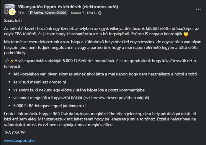 Ötletes megoldással rukkolt elő a TEA. elektromobilitás szolgáltató azért, hogy minden töltőpontjuk megközelíthető legyen a hóviszonyok ellenére: 5000 forint értékű ajándékot kap, aki kiszabadít egy olyan TEA. töltőt a hó fogságából, ahol a parkoló tulajdonosa valamiért nem tudta ezt elvégezni. Kép: TEA. Több olvasónk is jelezte, hogy az elmúlt napokban országszerte fennakadásokat okozó havazás az elektromosautó-töltést is nehezíti: egyes töltőpontok nehezen megközelíthetők a mély hóban. A TEA. a Villanyautós Tippek és kérdések Facebook csoportban mondott köszönetet egy lelkes villanyautósnak, aki idejét és energiáját nem kímélve elérhetővé tette a cég egyik töltőpontját. Az önkéntes akción felbuzdulva a szolgáltató másoknak is felajánlott egy 5000 forintos töltésre felhasználható bérletet, amennyiben előtte-utána fotóval igazolják, hogy olyan TEA. töltőt találtak, ahol a terület tulajdonosa még nem tudta megoldani a takarítást, a villanyautós azonban önkéntesen elvégezte a feladatot. PGEgaHJlZj0iaHR0cHM6Ly9hZC5kb3VibGVjbGljay5uZXQvZGRtL3RyYWNrY2xrL04yMjM3MjkwLjM3MzM0MjhWSUxMQU5ZQVVUT1NPSy5IL0IzMzczMTQwNS40MjQyODMyODU7ZGNfdHJrX2FpZD02MTcxMzkzNzk7ZGNfdHJrX2NpZD0yMzc5OTgwNDY7ZGNfbGF0PTtkY19yZGlkPTt0YWdfZm9yX2NoaWxkX2RpcmVjdGVkX3RyZWF0bWVudD07dGZ1YT07Z2Rwcj0kR0RQUjtnZHByX2NvbnNlbnQ9JEdEUFJfQ09OU0VOVF83NTU7bHRkPTtkY190ZHY9MSIgb25jbGljaz0iamF2YXNjcmlwdDp3aW5kb3cub3BlbignaHR0cHM6Ly9hZC5kb3VibGVjbGljay5uZXQvZGRtL3RyYWNrY2xrL04yMjM3MjkwLjM3MzM0MjhWSUxMQU5ZQVVUT1NPSy5IL0IzMzczMTQwNS40MjQyODMyODU7ZGNfdHJrX2FpZD02MTcxMzkzNzk7ZGNfdHJrX2NpZD0yMzc5OTgwNDY7ZGNfbGF0PTtkY19yZGlkPTt0YWdfZm9yX2NoaWxkX2RpcmVjdGVkX3RyZWF0bWVudD07dGZ1YT07Z2Rwcj0kR0RQUjtnZHByX2NvbnNlbnQ9JEdEUFJfQ09OU0VOVF83NTU7bHRkPTtkY190ZHY9MScsICdfYmxhbmsnLCAnbm9vcGVuZXInKTsgcmV0dXJuIGZhbHNlOyI+PHBpY3R1cmU+PHNvdXJjZSBzcmNzZXQ9Imh0dHBzOi8vdmlsbGFueWF1dG9zb2suaHUvd3AtY29udGVudC91cGxvYWRzLzIwMjUvMDYvc2hlbGwtcmVjaGFyZ2UtbXVsdC1qb3ZvLTEzMDB4NjAwLTEuanBnIiBtZWRpYT0iKG1pbi13aWR0aDogNzAwcHgpIj48aW1nIHNyYz0iaHR0cHM6Ly92aWxsYW55YXV0b3Nvay5odS93cC1jb250ZW50L3VwbG9hZHMvMjAyNS8wNi9zaGVsbC1yZWNoYXJnZS1tdWx0LWpvdm8tMTMwMHg2MDAtMS5qcGciIGFsdD0iIj48L3BpY3R1cmU+PC9hPjxpbWcgc3JjPWh0dHBzOi8vYWQuZG91YmxlY2xpY2submV0L2RkbS90cmFja2ltcC9OMjIzNzI5MC4zNzMzNDI4VklMTEFOWUFVVE9TT0suSC9CMzM3MzE0MDUuNDI0MjgzMjg1O2RjX3Rya19haWQ9NjE3MTM5Mzc5O2RjX3Rya19jaWQ9MjM3OTk4MDQ2O29yZD1bdGltZXN0YW1wXTtkY19sYXQ9O2RjX3JkaWQ9O3RhZ19mb3JfY2hpbGRfZGlyZWN0ZWRfdHJlYXRtZW50PTt0ZnVhPT9odHRwczovL3Rwcy5kb3VibGV2ZXJpZnkuY29tL3Zpc2l0LmpwZz90YWd0eXBlPWRpc3BsYXkmY3R4PTMxODAxNDIzJmNtcD0zMzczMTQwNSZzaWQ9MTAxNjk1OTUmcGxjPTQyNDI4MzI4NSZhZHZpZD0xMzkxOTQzMiZhZHNydj0xJmdkcHI9JHtHRFBSfSZnZHByX2NvbnNlbnQ9JHtHRFBSX0NPTlNFTlRfMTI2fXdpZHRoPTEiIGhlaWdodD0iMSIgc3R5bGU9ImRpc3BsYXk6bm9uZTsiIGFsdD0iIj4= Szűcs Gábor2017 óta aktív villanyautós, a Villanyautósok Közösségének oszlopos tagja, a miskolci találkozók szervezője. Környezettudatos családapaként nem csak az autó üzemanyagát, de a háztartás fogyasztását is igyekszik otthon, a háztetőn (áram) és a kertben (zöldség, gyümölcs) megtermelni. Mert nem mindegy, hogy mit eszünk meg és milyen levegőt szívunk be. Google hírek iratkozz fel! Heti hírlevél iratkozz fel! Kővédő fólia védd az autód!