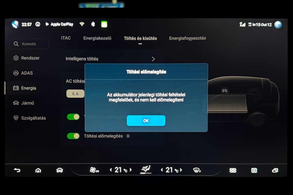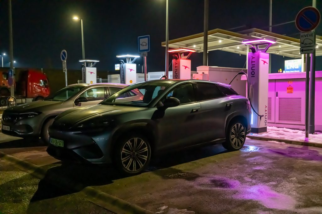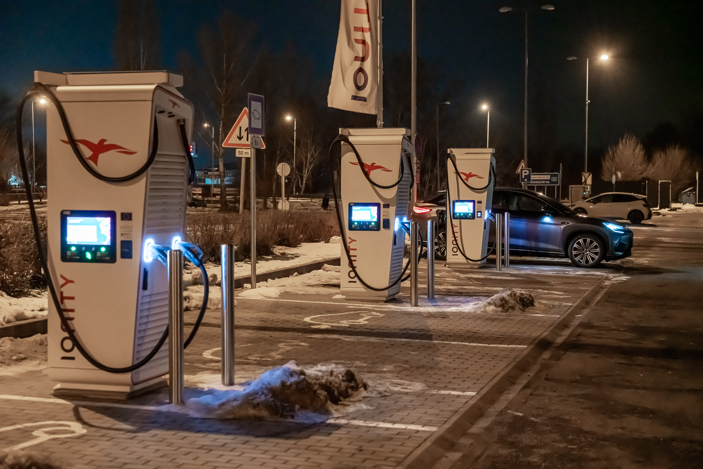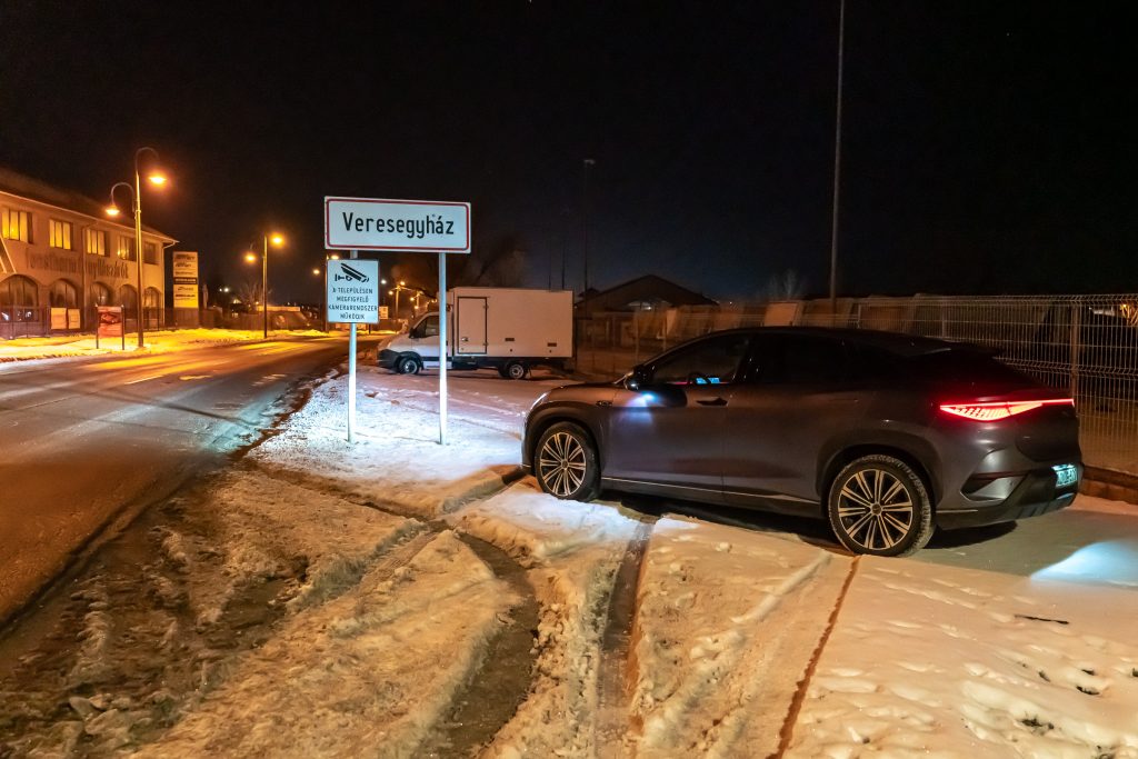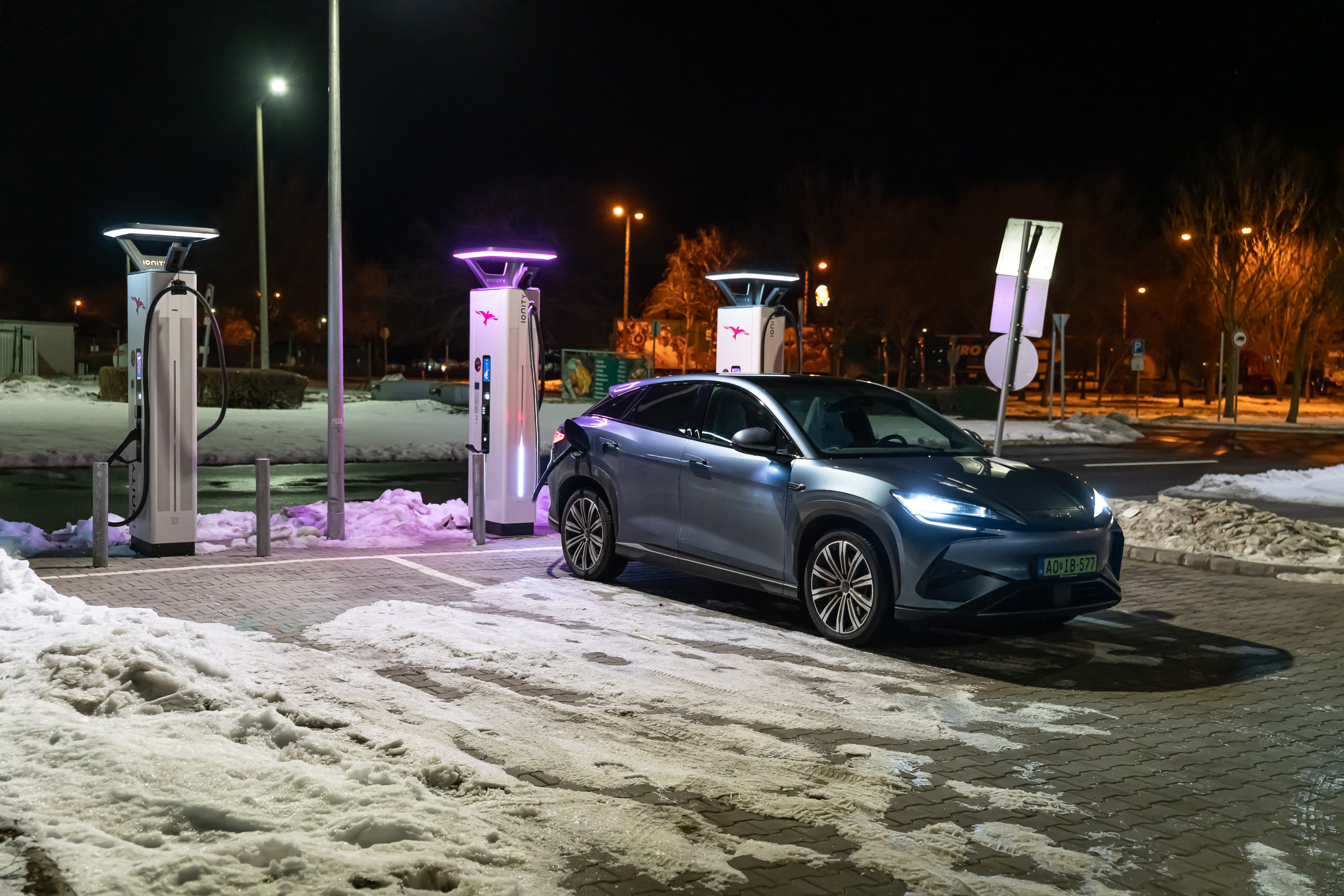 A részletes tesztjeink elmaradhatatlan része a töltésteszt. 10% alá merült autóval, az akkut jól előkészítve elmegyünk egy 300 vagy 400 kW-os E.ON Drive Infrastructure töltőhöz, ahol teletöltjük az autót, hogy legyen egy olyan görbénk, amin látszik, hogy milyen töltöttségnél milyen teljesítménnyel képes tölteni az autó. A BYD Sealion 7 Excellence is megkapta a lehetőséget, de valahogy csak nem akart összejönni a gyártó által megadott 235 kW-os töltési teljesítmény. Annyira nem, hogy 115 kW-nál magasabb értéket nem is láttam a kijelzőn. Szinte biztos, hogy a fagypont alatti éjszakai hőmérséklet lehetett az oka, amit követően a töltőhöz vezető több mint félórás út sem volt elég arra, hogy az akku megfelelő hőmérsékletűre melegedjen. Ahhoz, hogy újra nekifussak a tesztnek, le kell meríteni az akkut, de 91 kWh energia esetén ehhez azért sokat kell autózni. Feleslegesen nem akartam, ezért „elmentem” vele inkább az Adriára. De mi ez az Adria szimuláció? Tudom mi ez, átugornám Magyarországról sokan járnak nyaranta Horvátországba pihenni. Budapesttől Split nagyjából 800 km-re található, amit vehetünk egy átlagos távnak. Aki a horvát tengerpart északi részét célozza meg az kevesebbet, aki a déli szakaszra megy, az többet utazik egy picit. Mi ezt a Budapest-Split távot szimuláljuk egy magyarországi körön. Már többször, több autóval megtettük ezt az utat (linkek a cikk végén), azonban az eredetihez képest néhányszor módosítottunk az útvonalon. Ezúttal Veresegyházról indultam kelet felé az M3-as autópályán, majd az oszlári lehajtónál fordultam vissza, Budapest felé, amit az M0-n kerültem meg (visszafele is), az M7-esen az első nagykanizsai lehajtónál fordultam. Így a teljes út töltések nélkül a Google Maps szerint pont 800 km. Pontosan ugyanaz az útvonal, mint legutóbb Mercedes CLA vs Tesla Model 3 összehasonlításnál. Adja magát a kérdés, hogy miért nem megyünk le valóban Splitig az autóval, mégis csak az lenne az igazán hiteles. Ez kétségtelenül így van, de akkor nemcsak odafelé, hanem a visszaútra is rá kellene szánni azt a 8 órát, a töltések árát és az autópálya díjakat. Sokkal praktikusabb, ha olyan útvonalon tesztelünk, aminek a vége a kiindulási pontban van. 20:01 – Indulás Veresegyházról Este 7-kor akartam indulni, hogy a forgalom már ne akadályozzon, de hajnali 3 körül hazaérjek. Az akkuból a 100%-os töltöttséghez hiányzó kWh-kat az otthoni Voltie töltőn terveztem beletolni, de csak induláskor vettem észre, hogy a töltés áll. Az autóhoz nem volt applikációs hozzáférésem, a Voltie üzenetét (ha küldött) nem láttam. Így 7 után néhány perccel nem az Adriára, hanem a közeli TEA DC töltőhöz mentem, ahonnan 8 óra után végül 98%-ös töltöttséggel (448 km jósolt hatótáv) indulhattam. A BYD navigációja sajnos nem teszi lehetővé, hogy az útvonal mentén egynél több közbülső pontot is hozzáadjunk vagy ezek sorrendjét szerkesszük, így a teljes útvonalra nem tudtam vele se menetidőt se töltéseket tervezni úgy, ahogy azt a Teslákkal vagy a Mercedes CLA-val legutóbb tettük. A töltőkkel egyébként tud tervezni az autó, de ilyenkor télen irreálisan alacsony fogyasztással számol, arra nem igazán lehet hagyatkozni. Az oszlári fordulóponthoz például úgy számolt, hogy ott még 64 százalékon lesz az akku töltöttsége. A valóságban azonban már az első 131 km-en elfogyott az akkuból 50 százaléknyi energia, Oszlárnál pedig már csak 44 százalék volt az akkuban. Hamar egyértelművé vált, hogy az első megállót nem Szigetszentmiklósra, hanem a geleji Ionity állomásra kell tervezzem. Miért Ionity? Ma ezen az útvonalon többféle szolgáltató töltőin is tölthetnénk, de több oka is van, hogy általában az Ionity-t használjuk. A legfontosabb, hogy minden töltőjük az autópályához közel található, nagyon kevés időt veszítünk a töltő megközelítésével és a pályára való visszahajtással. Minden helyszínen van éjjel is mosdó és mindegyik állomásuk legalább 350 kW-os. Ráadásul egy előfizetéssel relatíve megfizethető áron tudunk tölteni. A BYD Sealion 7 egy 800 voltos (igazából inkább 600 volt, a lényeg, hogy 500 voltnál magasabb a feszültség) rendszerű autó, ami papíron 235 kW-tal képes tölteni, így mindenképpen legalább 300 kW-os töltőket kell célba vennem, ha nem szeretném, hogy az infrastruktúra hátráltasson a haladásban. 21:24 – Gelej észak, Ionity (163 km, 1 óra 23 perc) Szokatlanul rövid lett az első etap. Mehettem volna még 20-25 percet, de sajnos még nem ennyire sűrű az Ionity hálózat ezen az útszakaszon. Ráadásul értelme sem sok lett volna, mert mint kiderült, az akku az előmelegítés kézi bekapcsolása ellenére sem volt elég meleg ahhoz, hogy a -4 °C-os külső hőmérséklet mellett a Sealion 7 154 kW-nál nagyobb teljesítménnyel töltsön. Töltöttség érkezéskor Állás ideje Töltés ideje Betöltött energia Töltési teljesítmény Töltöttség induláskor 36% 13 perc 11 perc 27 kWh 147,3 kW 65% Ennek ellenére elég volt 11 perc, hogy 36-ról 65 százalékra töltsem az akkut. Úgy számoltam, hogy ha 34 kWh-t fogyaszt 100 kilométerenként az autó, akkor a következő 163 km-re 55,4 kWh energia, vagyis 61%-os töltöttségre lesz szükségem. Hogy ne nulla százalékkal essek be a töltőhöz, inkább 65 százalékig töltöttem, de azt is tudtam, hogy az M0-n a 110 km-es sebességkorlátozás miatt alacsonyabb lesz a fogyasztás, tehát valahol 5 és 10 százalék közötti érkezésre számítottam. A navigáció már 53 százalékos töltöttségnél is 22 százalékos érkezéskori szintet jósolt Szigetszentmiklósra. Nem szabad hinni neki. Egyébként furcsa, de töltés közben csak a százalékos töltöttséget írja