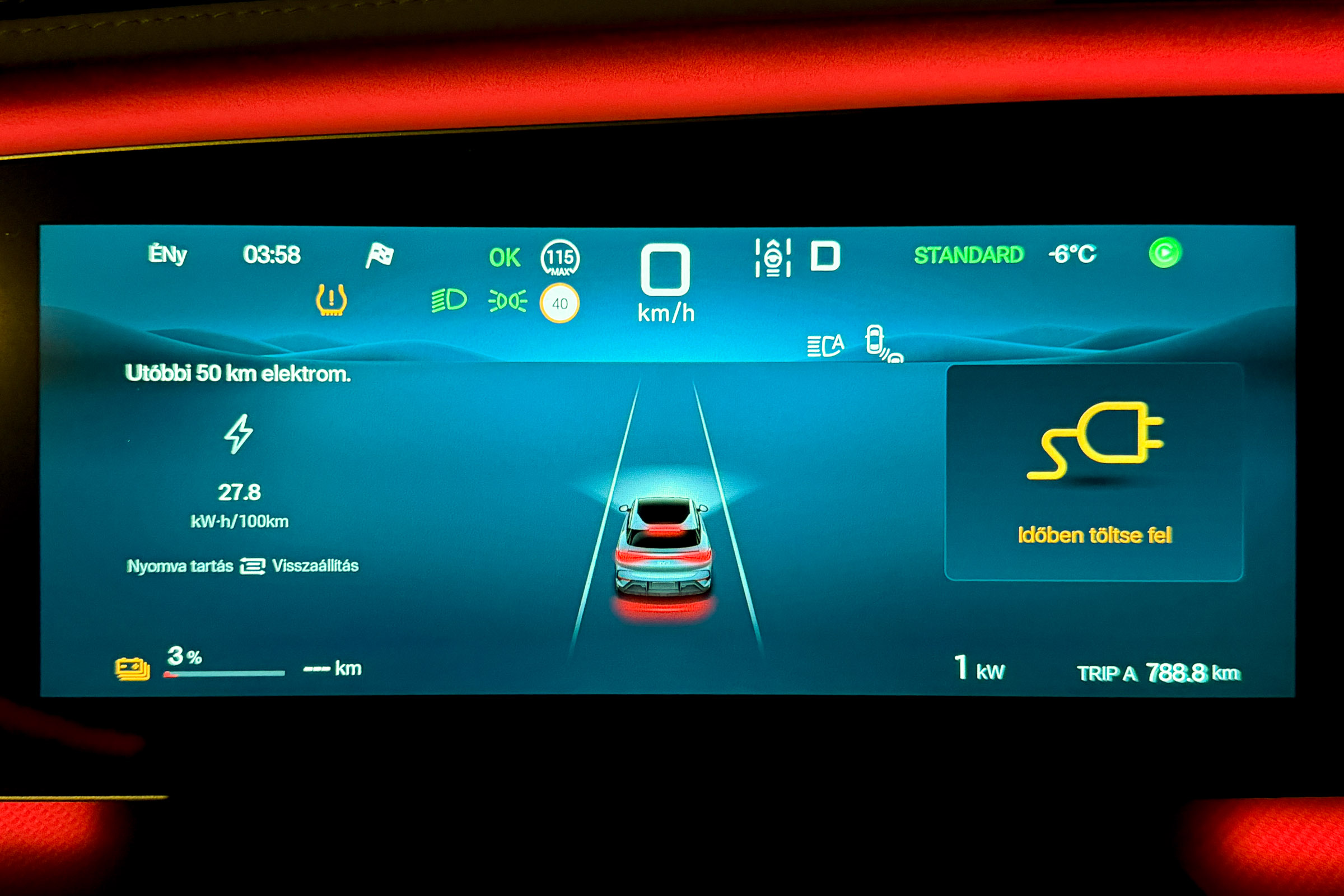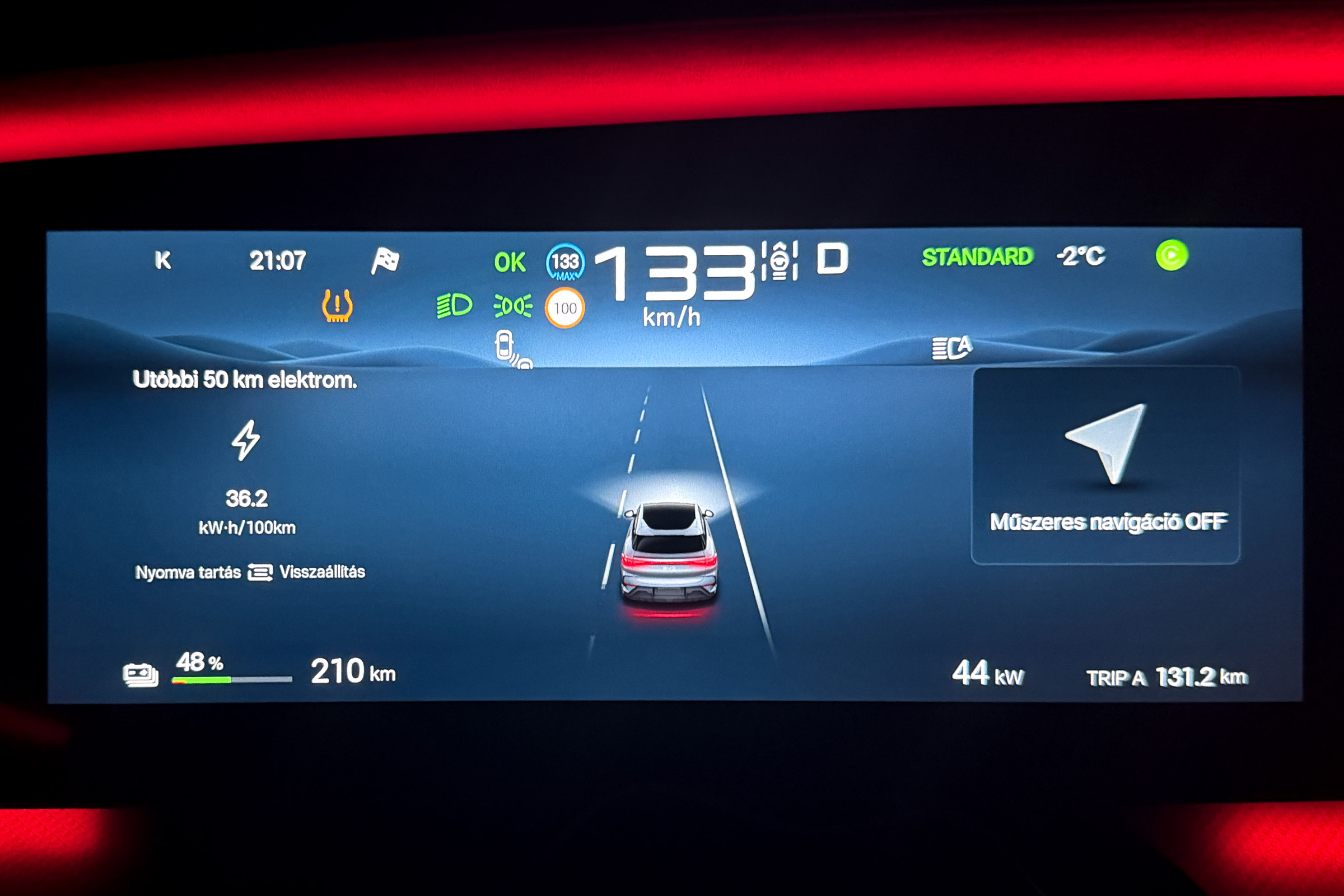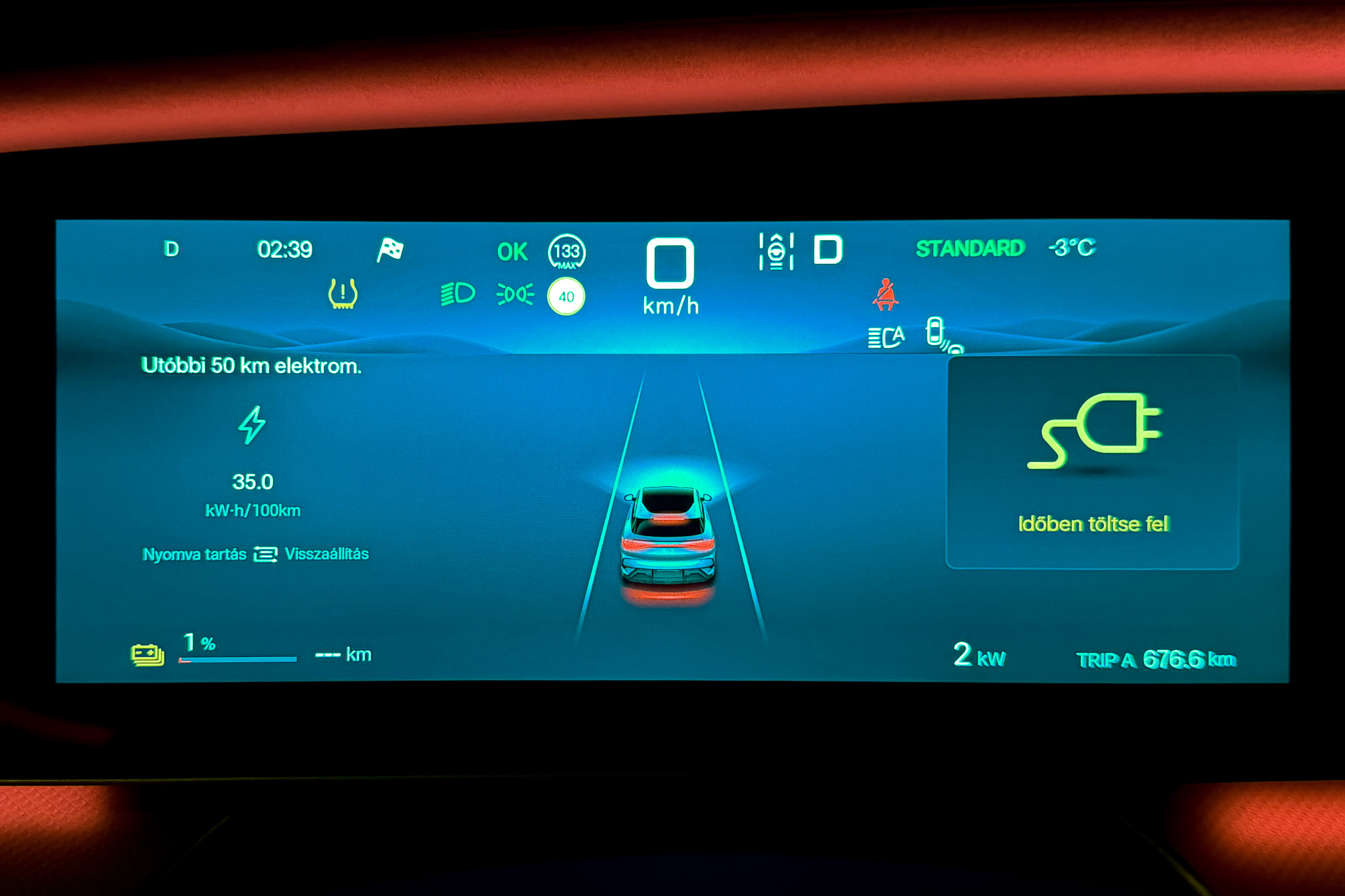 A részletes tesztjeink elmaradhatatlan része a töltésteszt. 10% alá merült autóval, az akkut jól előkészítve elmegyünk egy 300 vagy 400 kW-os E.ON Drive Infrastructure töltőhöz, ahol teletöltjük az autót, hogy legyen egy olyan görbénk, amin látszik, hogy milyen töltöttségnél milyen teljesítménnyel képes tölteni az autó. A BYD Sealion 7 Excellence is megkapta a lehetőséget, de valahogy csak nem akart összejönni a gyártó által megadott 235 kW-os töltési teljesítmény. Annyira nem, hogy 115 kW-nál magasabb értéket nem is láttam a kijelzőn. Szinte biztos, hogy a fagypont alatti éjszakai hőmérséklet lehetett az oka, amit követően a töltőhöz vezető több mint félórás út sem volt elég arra, hogy az akku megfelelő hőmérsékletűre melegedjen. Ahhoz, hogy újra nekifussak a tesztnek, le kell meríteni az akkut, de 91 kWh energia esetén ehhez azért sokat kell autózni. Feleslegesen nem akartam, ezért „elmentem” vele inkább az Adriára. De mi ez az Adria szimuláció? Tudom mi ez, átugornám Magyarországról sokan járnak nyaranta Horvátországba pihenni. Budapesttől Split nagyjából 800 km-re található, amit vehetünk egy átlagos távnak. Aki a horvát tengerpart északi részét célozza meg az kevesebbet, aki a déli szakaszra megy, az többet utazik egy picit. Mi ezt a Budapest-Split távot szimuláljuk egy magyarországi körön. Már többször, több autóval megtettük ezt az utat (linkek a cikk végén), azonban az eredetihez képest néhányszor módosítottunk az útvonalon. Ezúttal Veresegyházról indultam kelet felé az M3-as autópályán, majd az oszlári lehajtónál fordultam vissza, Budapest felé, amit az M0-n kerültem meg (visszafele is), az M7-esen az első nagykanizsai lehajtónál fordultam. Így a teljes út töltések nélkül a Google Maps szerint pont 800 km. Pontosan ugyanaz az útvonal, mint legutóbb Mercedes CLA vs Tesla Model 3 összehasonlításnál. Adja magát a kérdés, hogy miért nem megyünk le valóban Splitig az autóval, mégis csak az lenne az igazán hiteles. Ez kétségtelenül így van, de akkor nemcsak odafelé, hanem a visszaútra is rá kellene szánni azt a 8 órát, a töltések árát és az autópálya díjakat. Sokkal praktikusabb, ha olyan útvonalon tesztelünk, aminek a vége a kiindulási pontban van. 20:01 – Indulás Veresegyházról Este 7-kor akartam indulni, hogy a forgalom már ne akadályozzon, de hajnali 3 körül hazaérjek. Az akkuból a 100%-os töltöttséghez hiányzó kWh-kat az otthoni Voltie töltőn terveztem beletolni, de csak induláskor vettem észre, hogy a töltés áll. Az autóhoz nem volt applikációs hozzáférésem, a Voltie üzenetét (ha küldött) nem láttam. Így 7 után néhány perccel nem az Adriára, hanem a közeli TEA DC töltőhöz mentem, ahonnan 8 óra után végül 98%-ös töltöttséggel (448 km jósolt hatótáv) indulhattam. A BYD navigációja sajnos nem teszi lehetővé, hogy az útvonal mentén egynél több közbülső pontot is hozzáadjunk vagy ezek sorrendjét szerkesszük, így a teljes útvonalra nem tudtam vele se menetidőt se töltéseket tervezni úgy, ahogy azt a Teslákkal vagy a Mercedes CLA-val legutóbb tettük. A töltőkkel egyébként tud tervezni az autó, de ilyenkor télen irreálisan alacsony fogyasztással számol, arra nem igazán lehet hagyatkozni. Az oszlári fordulóponthoz például úgy számolt, hogy ott még 64 százalékon lesz az akku töltöttsége. A valóságban azonban már az első 131 km-en elfogyott az akkuból 50 százaléknyi energia, Oszlárnál pedig már csak 44 százalék volt az akkuban. Hamar egyértelművé vált, hogy az első megállót nem Szigetszentmiklósra, hanem a geleji Ionity állomásra kell tervezzem. Miért Ionity? Ma ezen az útvonalon többféle szolgáltató töltőin is tölthetnénk, de több oka is van, hogy általában az Ionity-t használjuk. A legfontosabb, hogy minden töltőjük az autópályához közel található, nagyon kevés időt veszítünk a töltő megközelítésével és a pályára való visszahajtással. Minden helyszínen van éjjel is mosdó és mindegyik állomásuk legalább 350 kW-os. Ráadásul egy előfizetéssel relatíve megfizethető áron tudunk tölteni. A BYD Sealion 7 egy 800 voltos (igazából inkább 600 volt, a lényeg, hogy 500 voltnál magasabb a feszültség) rendszerű autó, ami papíron 235 kW-tal képes tölteni, így mindenképpen legalább 300 kW-os töltőket kell célba vennem, ha nem szeretném, hogy az infrastruktúra hátráltasson a haladásban. 21:24 – Gelej észak, Ionity (163 km, 1 óra 23 perc) Szokatlanul rövid lett az első etap. Mehettem volna még 20-25 percet, de sajnos még nem ennyire sűrű az Ionity hálózat ezen az útszakaszon. Ráadásul értelme sem sok lett volna, mert mint kiderült, az akku az előmelegítés kézi bekapcsolása ellenére sem volt elég meleg ahhoz, hogy a -4 °C-os külső hőmérséklet mellett a Sealion 7 154 kW-nál nagyobb teljesítménnyel töltsön. Töltöttség érkezéskor Állás ideje Töltés ideje Betöltött energia Töltési teljesítmény Töltöttség induláskor 36% 13 perc 11 perc 27 kWh 147,3 kW 65% Ennek ellenére elég volt 11 perc, hogy 36-ról 65 százalékra töltsem az akkut. Úgy számoltam, hogy ha 34 kWh-t fogyaszt 100 kilométerenként az autó, akkor a következő 163 km-re 55,4 kWh energia, vagyis 61%-os töltöttségre lesz szükségem. Hogy ne nulla százalékkal essek be a töltőhöz, inkább 65 százalékig töltöttem, de azt is tudtam, hogy az M0-n a 110 km-es sebességkorlátozás miatt alacsonyabb lesz a fogyasztás, tehát valahol 5 és 10 százalék közötti érkezésre számítottam. A navigáció már 53 százalékos töltöttségnél is 22 százalékos érkezéskori szintet jósolt Szigetszentmiklósra. Nem szabad hinni neki. Egyébként furcsa, de töltés közben csak a százalékos töltöttséget írja
