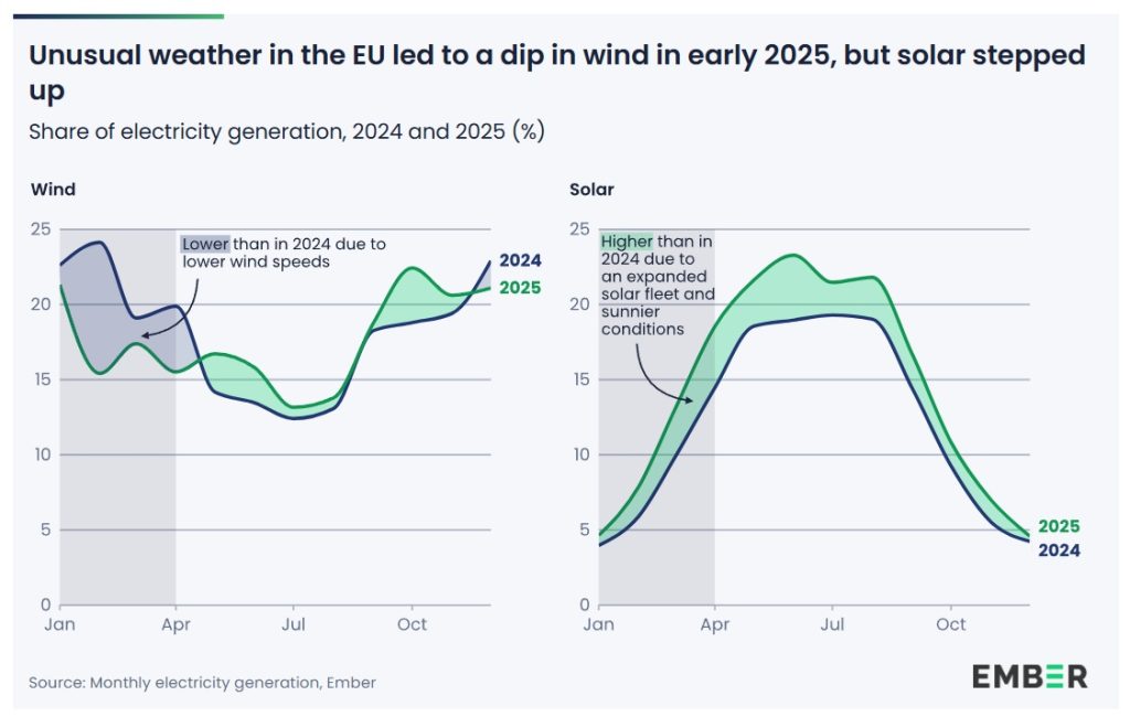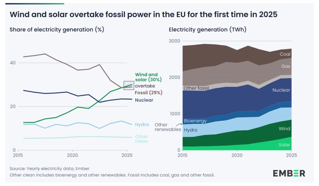 Bár az Európai Unióban 2025-ben is folytatódott az energiaátállás, tavaly már inkább a háztartások és a vállalkozások energiaköltségeinek csökkentése került a döntéshozók intézkedéseinek fókuszába. Az Európai Bizottság megfizethető energia cselekvési terve helyesen diagnosztizálja a magas európai energiaárak kiváltó okát: a drága importált fosszilis energiahordozóktól való függőséget. Az energiaágazatban a szén egyre inkább kifutóban van, és több évnyi meredek csökkenés után tavaly új történelmi mélypontot ért el, de az is újdonságot jelentett 2025-ben, hogy a szél- és a napenergia együttesen már több villamos energiát biztosítottak, mint a fosszilis energiahordozók. Az EU azonban továbbra is túlzott mértékben függ a földgáztól. A növekvő kereslet, illetve a vízerőművek termelésének visszaesése és a kevésbé szeles időjárás megnövelte az EU gázimportját, ami áremelkedéshez vezetett a villamosenergia-piacokon – derül ki a londoni székhelyű agytröszt, az Ember legújabb jelentéséből. A következőkben ennek a jelentésnek a legfontosabb megállapításait foglaljuk össze. Az EU villamosenergia-termelése 2024-ben Az EU tagországai tavaly 2792 TWh (+0,9%) villamos energiát állítottak elő, amelyből 22 TWh-t exportáltak – az export legnagyobb részét a Franciaországból az Egyesült Királyságba irányuló szállítás tette ki. A kontextus kedvéért a fenti számot kiegészítenénk azzal az információval, hogy az Unió villamosenergia-termelése a világ teljes felhasználásának kevesebb mint az egytizedét, a kínai értéknek pedig a bő negyedét érte el. A tagállamok áramfogyasztása 2025-ben 0,6%-kal (15 TWh-val) növekedett 2024-hez képest, ugyanakkor a 2019-es értéktől még mindig elmaradt néhány százalékkal. 2024 2025 változás Termelés 2767 TWh 2792 TWh +0,9% Export 12 TWh 22 TWh +83% Felhasználás 2755 TWh 2770 TWh +0,6% A fosszilis energia 29%-os arányt ért el a villamosenergia-mixen belül, egy hajszálnyival többet, mint az előző évben (28,6%). A napenergia dinamikus növekedésének köszönhetően ugyanakkor az időjárásfüggő megújulók – a tavalyi évben először – megelőzték a fosszilis energiát. Bár időről időre előfordulnak rövidebb ideig tartó megtorpanások, a fosszilis energiaforrások visszaszorulása mostanra már tendenciózusnak nevezhető. Évtizedes időtávon látványos a változás: Fosszilis energia Noha a szén felhasználása csökkent 2025-ben, az EU fosszilis villamosenergia-termelése összességében 17 TWh-val (+2%) növekedett az előző évhez képest a gázerőművek nagyobb kihasználtsága miatt, de a tavalyi 809 TWh még így is a második legalacsonyabb értéket jelenti az elmúlt 40 évben. A növekedés hátterében részben az energiafelhasználás (+15 TWh), illetve a nem uniós országokba irányuló nettó export (+10 TWh) növekedése, részben pedig a vízerőművek (-43 TWh) és szélerőművek (-12 TWh) termelésének visszaesése áll. A szén 2025-ben is tovább csökkent, és 257 TWh-val már csak az EU energiaellátásának kevesebb mint egytizedét (9,2%) adta, ami új történelmi mélypontot jelent. Ez figyelemre méltó változás, ha azt nézzük, hogy tíz évvel korábban még az EU villamosenergia-termelésének csaknem egynegyedét (24,6%) tette ki, 705 TWh-val. A szén aránya az EU energiamixében jóval alacsonyabb a globális átlagnál (ami 33,1% volt 2025 első felében). Szerencsére a szén felhasználásának csökkenését az elmúlt tíz évben nem követte a gáz vagy más fosszilis tüzelőanyagok felhasználásának azonos mértékű növekedése. Az EU fennmaradó szénalapú energiatermelése elsősorban két országra, Németországra és Lengyelországra koncentrálódik, amelyek 2025-ben az EU szénalapú energiatermelésének több mint 74%-át adták. Azonban itt is csökkent a felhasználás 2024-hez képest: Németországban 3,2%-kal, Lengyelországban pedig 6,6%-kal. A gázerőművek termelése 2019-ben érte el a csúcsot 569 TWh-val, azóta az EU-ban a gázalapú villamosenergia-termelés öt egymást követő évben csökkent, és 2024-ben 432 TWh-ra esett vissza. 2025-ben azután ismét növekedett (+34 TWh, +8 % 2024-hez képest), de továbbra is alacsonyabb szinten maradt, mint a szélenergia, és a felhasználás 16,7%-át biztosította. A megnövekedett gázfelhasználás és a magasabb gázárak (+5,6% 2024-hez képest) együttesen azt jelentették, hogy tavaly az EU 32 milliárd eurót költött gázimportra áramtermelési célból, ami 16%-kal több, mint 2024-ben. Ez az első éves növekedés az EU gázimport-számlájában a 2022-es energiaválság óta. 2025-ben azonban nem minden tagországban nőtt a gázalapú villamosenergia-termelés. A gázfogyasztás az EU 27 tagállama közül 15-ben nőtt, Spanyolország (+9,7 TWh, +19%), Olaszország (+6,5 TWh, +5,5%) és Németország (+4,3 TWh, +5,4%) együttesen a növekedés 60%-át adták. Mindhárom ország esetében fontos tényező volt a belföldi és külföldi vízenergia-termelés csökkenése. Atomenergia és tradicionális megújulók A nukleáris energiatermelés 2025-ben lényegében stagnált és 652 TWh-val az EU-s áramtermelés 23,4%-át biztosította. A vízenergia ezzel szemben 12%-os csökkenést szenvedett el a kedvezőtlenebbre forduló időjárás miatt, a vízerőművek termelése így 370 TWh-ról 327 TWh-ra esett vissza, a részesedésük pedig 11,7% volt az EU villamosenergia-mixén belül. Időjárásfüggő megújulók Az elmúlt évtizedben a szélenergia és a napenergia folyamatos növekedési tendenciát mutatott. Ez az elmúlt öt évben felgyorsult, amikor részesedésük az EU energiaellátásában több mint 10 százalékponttal nőtt (19,7 %-ról 30,1 %-ra). A fosszilis energiaforrások mindeközben visszaszorultak, a részesedésük az EU 
