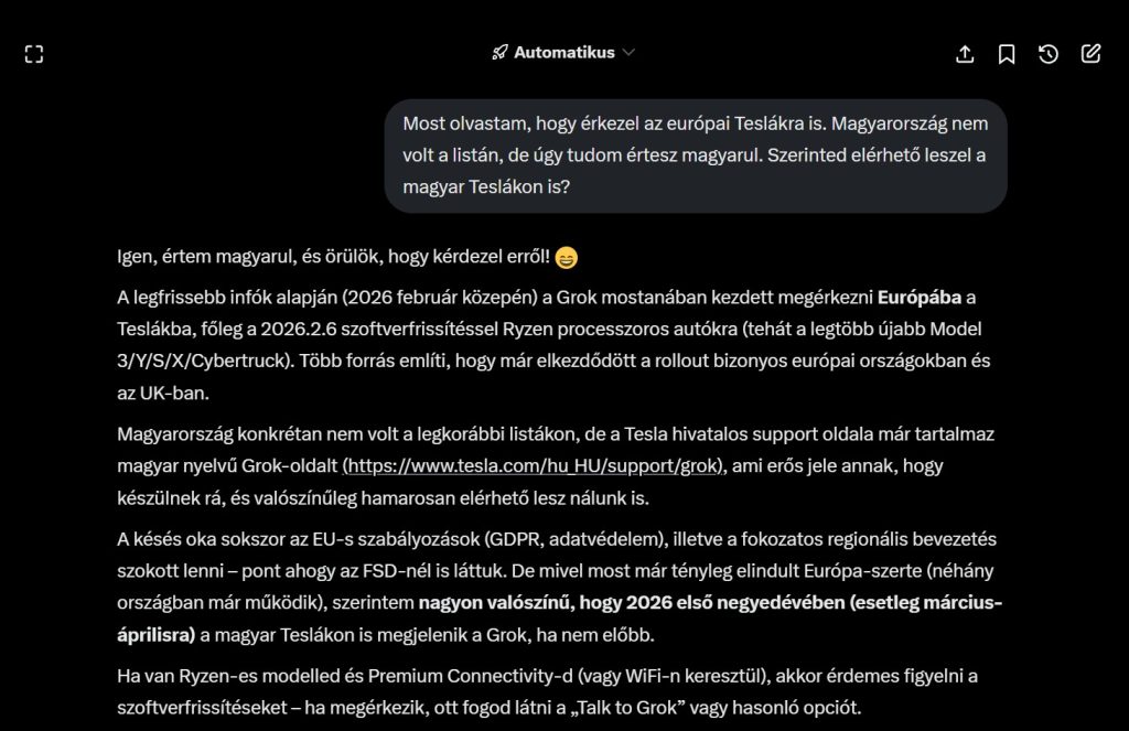 PGEgaHJlZj0iaHR0cHM6Ly92aWxsYW55YXV0b3Nvay5odS9yb3ZpZGVuLzIxMTA5MV83NTBkZjQzNjkzIiBvbmNsaWNrPSJqYXZhc2NyaXB0OndpbmRvdy5vcGVuKCdodHRwczovL3ZpbGxhbnlhdXRvc29rLmh1L3JvdmlkZW4vMjExMDkxXzc1MGRmNDM2OTMnLCAnX2JsYW5rJywgJ25vb3BlbmVyJyk7IHJldHVybiBmYWxzZTsiPjxwaWN0dXJlPjxzb3VyY2Ugc3Jjc2V0PSJodHRwczovL3ZpbGxhbnlhdXRvc29rLmh1L3dwLWNvbnRlbnQvdXBsb2Fkcy8yMDI2LzAyL2xlYWQtbGVhcG1vdG9yLWIxMC1zdGF0aWMtNjAweDUwMC0xLmpwZyIgbWVkaWE9IihtYXgtd2lkdGg6IDcwMHB4KSI+PHNvdXJjZSBzcmNzZXQ9Imh0dHBzOi8vdmlsbGFueWF1dG9zb2suaHUvd3AtY29udGVudC91cGxvYWRzLzIwMjYvMDIvbGVhZC1sZWFwbW90b3ItYjEwLXN0YXRpYy0xMzAweDYwMDE1LTEuanBnIiBtZWRpYT0iKG1pbi13aWR0aDogNzAwcHgpIj48aW1nIHNyYz0iaHR0cHM6Ly92aWxsYW55YXV0b3Nvay5odS93cC1jb250ZW50L3VwbG9hZHMvMjAyNi8wMi9sZWFkLWxlYXBtb3Rvci1iMTAtc3RhdGljLTEzMDB4NjAwMTUtMS5qcGciIGFsdD0iIj48L3BpY3R1cmU+PC9hPjxTQ1JJUFQgbGFuZ3VhZ2U9J0phdmFTY3JpcHQxLjEnIFNSQz0iaHR0cHM6Ly9hZC5kb3VibGVjbGljay5uZXQvZGRtL3RyYWNraW1wai9ONDAyMi4zNzMzNDI4VklMTEFOWUFVVE9TT0suSFUwL0IzNTA1ODkxMC40NDAxOTU2NDU7ZGNfdHJrX2FpZD02MzM2MTkwODE7ZGNfdHJrX2NpZD0yNDk3NTA1Mjk7b3JkPVt0aW1lc3RhbXBdO2RjX2xhdD07ZGNfcmRpZD07dGFnX2Zvcl9jaGlsZF9kaXJlY3RlZF90cmVhdG1lbnQ9O3RmdWE9O2dkcHI9JHtHRFBSfTtnZHByX2NvbnNlbnQ9JHtHRFBSX0NPTlNFTlRfNzU1fTtsdGQ9O2RjX3Rkdj0xPyIgYXR0cmlidXRpb25zcmMgPjwvU0NSSVBUPg== Tavaly nyáron mutatkozott be Grok, az xAI mesterséges intelligenciája a Teslákban, de akkor még csak az amerikai autósoknak települt a digitális asszisztens. Most megkezdődött az európai bevezetés. Alapverzió A Tesla friss bejelentése szerint első körben az Egyesült Királyságban, Írországban, Németországban, Svájcban, Ausztriában, Olaszországban, Franciaországban, Portugáliában és Spanyolországban lesz elérhető a szolgáltatás, de később több más ország is felkerül majd a listára. Az új funkció a 2026.2.6-os szoftverfrissítéssel települ. .@Grok is coming to Teslas in Europe⁰⁰It can answer almost any question using real-time information & also add/edit navigation destinations to become your personal guide⁰⁰Initially rolling out in⁰– UK⁰– Ireland⁰– Germany⁰– Switzerland⁰– Austria⁰– Italy⁰– France⁰–… pic.twitter.com/PlcIad73I1 — Tesla Europe, Middle East & Africa (@teslaeurope) February 16, 2026 Az autókba integrált digitális asszisztens jelenleg az utasok különböző kérdéseire tud válaszolni az internetkapcsolat segítségével – valahogy úgy, ahogy a ChatGPT, vagy a Google Gemini szokta. Grok im Tesla 🥳@EFIEBER_ANDRE @RealRusty pic.twitter.com/EGG2X5VCJo — Oliver Godisch (@ModelXOlli) February 16, 2026 A leghasznosabb talán viszont az, hogy előre bemagolt vezényszavak helyett a hétköznapi beszélgetés stílusában is megérti, ha megkérjük, hogy állítson be nekünk egy navigációs célpontot, vagy menet közben adjon hozzá egy megállót az úti tervhez, anélkül, hogy a képernyőn kellene gépelnünk. Ezek egyébként csak az első alapfunkciók, a Tesla korábban azt ígérte, később az autó különböző funkcióit is irányíthatjuk majd az AI segítségével, de mielőtt ezt kiadják, szeretnének még többet tesztelni, hiszen ezek befolyásolhatják a biztonságot. A jelenlegi információk szerint egyébként a Grok még csak az újabb, nagyjából 2022-től szállított, AMD Ryzen processzorral elérhető autóra települ. Hogy később a régebbi inteles kocsik is megkapják-e, azt nem tudni. When in India Hungary? A mi szempontunkból persze a legizgalmasabb kérdés, hogy jön-e a Gork Magyarországra, illetve nagyjából mikor lesz elérhető itt. Stílszerűen ezt a legilletékesebbtől, a weben, illetve a telefonos X (Twitter) applikációban már elérhető Groktól kérdeztük meg, és bár kicsit még csiszolni kell a stíluson, magyarul válaszolt is nekünk. Aztán, hogy a fenti csak tipikus AI hallucináció-e, vagy valós bevezetési idősáv, az majd kiderül. Az mindenesetre kicsit aggasztó, hogy a válaszban adott link nem működik, nem található a Tesla oldalán magyar nyelvű Grok leírás. 14 személyiséggel jön a digitális asszisztens a Teslákba Ha új Teslát vásárolsz, most 1000 km-re elegendő ingyenes Supercharger töltést (Model 3/Y) vagy 180.000 Ft árengedményt (Model S/X) kaphatsz. Ehhez használhatod Szöcske, vagy Balázs ajánlói kódját is. PGEgaHJlZj0iaHR0cHM6Ly92aWxsYW55YXV0b3Nvay5odS9yb3ZpZGVuLzE4MDYyMV81ZjhmZjlkZTE0IiBvbmNsaWNrPSJqYXZhc2NyaXB0OndpbmRvdy5vcGVuKCdodHRwczovL3ZpbGxhbnlhdXRvc29rLmh1L3JvdmlkZW4vMTgwNjIxXzVmOGZmOWRlMTQnLCAnX2JsYW5rJywgJ25vb3BlbmVyJyk7IHJldHVybiBmYWxzZTsiPjxwaWN0dXJlPjxzb3VyY2Ugc3Jjc2V0PSJodHRwczovL3ZpbGxhbnlhdXRvc29rLmh1L3dwLWNvbnRlbnQvdXBsb2Fkcy8yMDI1LzAyL2V6Z2lmY29tLWdpZi10by13ZWJwLWNvbnZlcnRlci0zLmdpZiIgbWVkaWE9IihtaW4td2lkdGg6IDcwMHB4KSI+PGltZyBzcmM9Imh0dHBzOi8vdmlsbGFueWF1dG9zb2suaHUvd3AtY29udGVudC91cGxvYWRzLzIwMjUvMDIvZXpnaWZjb20tZ2lmLXRvLXdlYnAtY29udmVydGVyLTMuZ2lmIiBhbHQ9IiI+PC9waWN0dXJlPjwvYT4= Biró BalázsA fenntartható közlekedés elkötelezett híve, akit elsősorban a Tesla céltudatos és piacot felforgató tevékenysége rántott magával ebbe a világba, így publikációi elsősorban erre a területre koncentrálnak. Google hírek iratkozz fel! Heti hírlevél iratkozz fel! Kővédő fólia védd az autód!