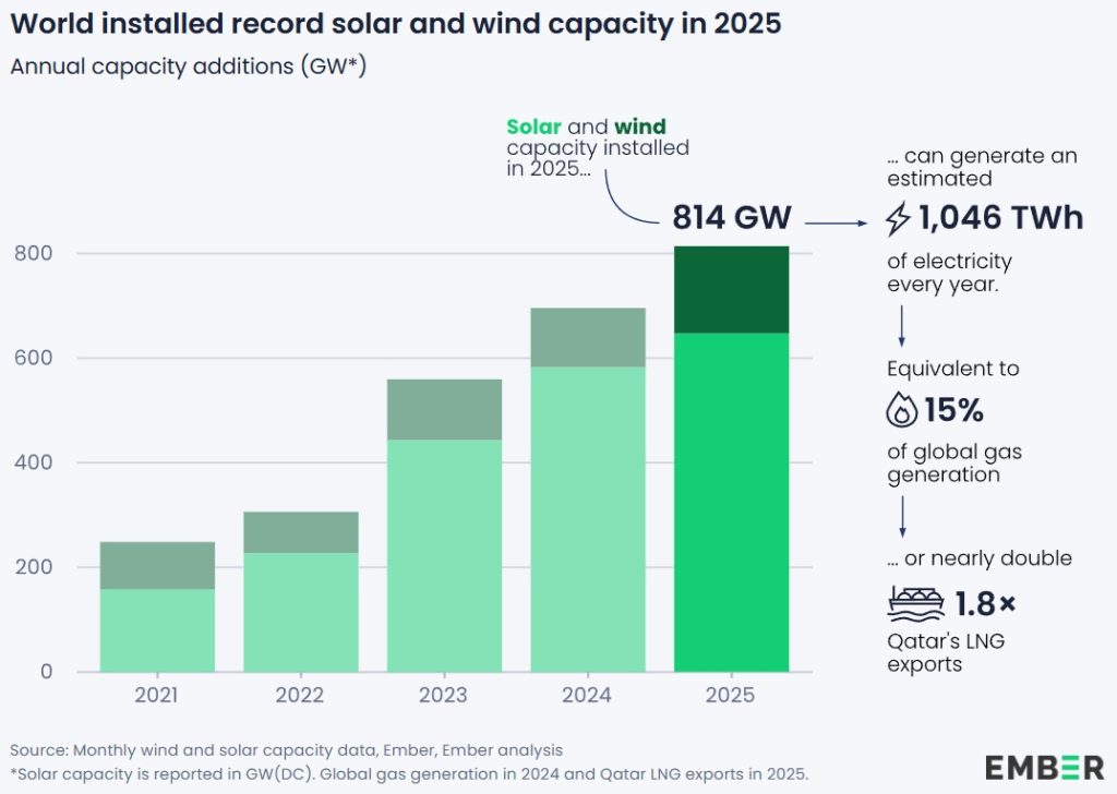 PGEgaHJlZj0iaHR0cHM6Ly92aWxsYW55YXV0b3Nvay5odS9yb3ZpZGVuLzIxMzE2Nl9lY2JhNDRkYTJhIiBvbmNsaWNrPSJqYXZhc2NyaXB0OndpbmRvdy5vcGVuKCdodHRwczovL3ZpbGxhbnlhdXRvc29rLmh1L3JvdmlkZW4vMjEzMTY2X2VjYmE0NGRhMmEnLCAnX2JsYW5rJywgJ25vb3BlbmVyJyk7IHJldHVybiBmYWxzZTsiPjxwaWN0dXJlPjxzb3VyY2Ugc3Jjc2V0PSJodHRwczovL3ZpbGxhbnlhdXRvc29rLmh1L3dwLWNvbnRlbnQvdXBsb2Fkcy8yMDI2LzAzL3Z3LWZhc3RzdGFydC1pZDMtNjAweDUwMC0xLmpwZyIgbWVkaWE9IihtYXgtd2lkdGg6IDcwMHB4KSI+PHNvdXJjZSBzcmNzZXQ9Imh0dHBzOi8vdmlsbGFueWF1dG9zb2suaHUvd3AtY29udGVudC91cGxvYWRzLzIwMjYvMDMvdnctZmFzdHN0YXJ0LWlkMy0xMzAweDYwMC0xLmpwZyIgbWVkaWE9IihtaW4td2lkdGg6IDcwMHB4KSI+PGltZyBzcmM9Imh0dHBzOi8vdmlsbGFueWF1dG9zb2suaHUvd3AtY29udGVudC91cGxvYWRzLzIwMjYvMDMvdnctZmFzdHN0YXJ0LWlkMy0xMzAweDYwMC0xLmpwZyIgYWx0PSIiPjwvcGljdHVyZT48L2E+PGEgaHJlZj0iaHR0cHM6Ly92aWxsYW55YXV0b3Nvay5odS9yb3ZpZGVuLzIxMzE2Nl9hNDliNDQyZjkwIiBvbmNsaWNrPSJqYXZhc2NyaXB0OndpbmRvdy5vcGVuKCdodHRwczovL3ZpbGxhbnlhdXRvc29rLmh1L3JvdmlkZW4vMjEzMTY2X2E0OWI0NDJmOTAnLCAnX2JsYW5rJywgJ25vb3BlbmVyJyk7IHJldHVybiBmYWxzZTsiPjxwaWN0dXJlPjxzb3VyY2Ugc3Jjc2V0PSJodHRwczovL3ZpbGxhbnlhdXRvc29rLmh1L3dwLWNvbnRlbnQvdXBsb2Fkcy8yMDI2LzAzL3Z3LWZhc3RzdGFydC1pZDQtNjAweDUwMC0xLmpwZyIgbWVkaWE9IihtYXgtd2lkdGg6IDcwMHB4KSI+PHNvdXJjZSBzcmNzZXQ9Imh0dHBzOi8vdmlsbGFueWF1dG9zb2suaHUvd3AtY29udGVudC91cGxvYWRzLzIwMjYvMDMvdnctZmFzdHN0YXJ0LWlkNC0xMzAweDYwMC0xLmpwZyIgbWVkaWE9IihtaW4td2lkdGg6IDcwMHB4KSI+PGltZyBzcmM9Imh0dHBzOi8vdmlsbGFueWF1dG9zb2suaHUvd3AtY29udGVudC91cGxvYWRzLzIwMjYvMDMvdnctZmFzdHN0YXJ0LWlkNC0xMzAweDYwMC0xLmpwZyIgYWx0PSIiPjwvcGljdHVyZT48L2E+PGEgaHJlZj0iaHR0cHM6Ly92aWxsYW55YXV0b3Nvay5odS9yb3ZpZGVuLzIxMzE2Nl9mNzM4NGVjMWMzIiBvbmNsaWNrPSJqYXZhc2NyaXB0OndpbmRvdy5vcGVuKCdodHRwczovL3ZpbGxhbnlhdXRvc29rLmh1L3JvdmlkZW4vMjEzMTY2X2Y3Mzg0ZWMxYzMnLCAnX2JsYW5rJywgJ25vb3BlbmVyJyk7IHJldHVybiBmYWxzZTsiPjxwaWN0dXJlPjxzb3VyY2Ugc3Jjc2V0PSJodHRwczovL3ZpbGxhbnlhdXRvc29rLmh1L3dwLWNvbnRlbnQvdXBsb2Fkcy8yMDI2LzAzL3Z3LWZhc3RzdGFydC1pZDctNjAweDUwMC0xLmpwZyIgbWVkaWE9IihtYXgtd2lkdGg6IDcwMHB4KSI+PHNvdXJjZSBzcmNzZXQ9Imh0dHBzOi8vdmlsbGFueWF1dG9zb2suaHUvd3AtY29udGVudC91cGxvYWRzLzIwMjYvMDMvdnctZmFzdHN0YXJ0LWlkNy0xMzAweDYwMC0xLmpwZyIgbWVkaWE9IihtaW4td2lkdGg6IDcwMHB4KSI+PGltZyBzcmM9Imh0dHBzOi8vdmlsbGFueWF1dG9zb2suaHUvd3AtY29udGVudC91cGxvYWRzLzIwMjYvMDMvdnctZmFzdHN0YXJ0LWlkNy0xMzAweDYwMC0xLmpwZyIgYWx0PSIiPjwvcGljdHVyZT48L2E+aHR0cHM6Ly93ZS50bC90LVFCdmV6cGRLTno= A londoni székhelyű energetikai agytröszt, az Ember adatai szerint a globális napenergia-telepítések 2025-ben elérték a 647 GW-ot, ami 11%-os növekedést jelent az előző évhez képest. A szélenergiával együtt a két technológia 2025-ben rekordot jelentő 814 GW új kapacitást kapcsolt a hálózatra. A 2025-ben telepített napenergia-kapacitás több mint fele, pontosabban 378 GW Kínából származott. Az ázsiai országban a tavaly megvalósult telepítések nagy része az év első felében történt, az első öt hónapban 237 GW-os növekedést regisztráltak, beleértve a májusban elért, rekordot jelentő 111 GW-ot, amit a naperőművek számára kedvezőtlenebbé váló szabályozás júniusi életbelépése ösztönzött. A közeljövő azonban kevésbé fényes az ágazat számára, a Kínai Napenergia-ipari Szövetség szerint ugyanis a következő években a kapacitásbővítés csökkenése várható: a szakmai szervezet előrejelzése szerint Kína 2026-ban 180–240 GW új napelemes kapacitást fog kiépíteni. Egy másik figyelemre méltó piac, amely 2025-ben rekordévet zárt, India, ahol 49 gigawattnyi új kapacitást helyeztek üzembe, szemben a 2024-es 31,9 GW-tal. Az elemzői várakozások szerint 2026-ban tovább fog gyorsulni a növekedés az országban. Bár az Egyesült Államokban a jelenlegi kormányzat mindent elkövet, hogy lassítsa a megújulók terjedését, egyelőre mérsékelt siker koronázza a törekvéseiket: a tavalyi évben 45 GW-tal nőtt az ország napelemes kapacitása, ami mindössze 3 GW-tal marad el az előző évi értéktől. Mint arról egy korábbi cikkünkben már beszámoltunk, az Európai Unió tavaly 65,1 gigawattnyi napelemet telepített a SolarPower Europe jelentése szerint, ami 0,7%-os csökkenés a 2024-es 65,6 GW-hoz képest. Magyarországon is enyhe lassulás volt megfigyelhető, mivel a 2024-es 1,2 GW után tavaly 1,1 GW-tal nőttek a napelemes kapacitásaink a MAVIR adatai szerint. Ebből 223 MW-ot tettek ki a háztartási méretű rendszerek, 159 MW-ot a saját célra termelő ipari méretű rendszerek, míg a közcélú hálózatra termelő naperőművek kapacitása 716 MW-tal bővült. A teljes hazai napelemes kapacitás 8,35 GW-on állt 2025 végén, ha az inverterek teljesítményét nézzük, a túlpanelezések miatt azonban az összesített DC oldali teljesítmény meghaladhatta a 10 GW-ot is. „A napenergia terjeszkedésének mértéke és sebessége az energiaágazatban eddig soha nem látott gyorsaságra kapcsolt. A szélenergia-kapacitás bővítésének felgyorsulásával együtt ezek a technológiák jó úton haladnak afelé, hogy a globális villamosenergia-ellátás gerincévé váljanak” – mondta Leonard Heberer, az Ember adatelemzője. A globális napenergia-kapacitás 2025 végén már 2,9 TW-t ért el, és valószínűleg 2026 első néhány hónapjában átlépte a 3 TW-os mérföldkövet. Az előző mérföldkőhöz 2024 novemberében értek el, és mindössze két évbe telt, hogy a kumulált telepített napenergia-kapacitás 1 TW-ról 2 TW-ra nőjön. Kína 1,4 TW-val egymaga a 2025 végén működő 2,9 TW-os napenergia-kapacitás közel felét adja. Az Ember hozzátette továbbá, hogy a közel-keleti konfliktus kezdete óta a világszerte jelenleg üzemelő összes napenergia- és szélenergia-kapacitás termelése révén közel 330 TWh-nak megfelelő gázalapú áramtermelést sikerült elkerülni. Ez több mint 40 milliárd dollár potenciális megtakarítást jelent. „A közel-keleti helyzet folyamatos eszkalálódása élesen emlékeztet az olaj- és gázfüggőségének kockázataira. A napenergia