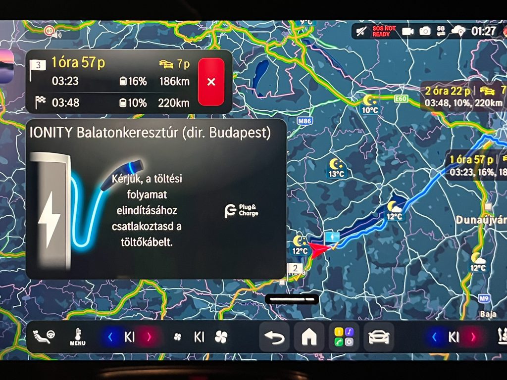 PGEgaHJlZj0iaHR0cHM6Ly92aWxsYW55YXV0b3Nvay5odS9yb3ZpZGVuLzIxMzM1Ml9lOTAxYTFmMWQ2IiBvbmNsaWNrPSJqYXZhc2NyaXB0OndpbmRvdy5vcGVuKCdodHRwczovL3ZpbGxhbnlhdXRvc29rLmh1L3JvdmlkZW4vMjEzMzUyX2U5MDFhMWYxZDYnLCAnX2JsYW5rJywgJ25vb3BlbmVyJyk7IHJldHVybiBmYWxzZTsiPjxwaWN0dXJlPjxzb3VyY2Ugc3Jjc2V0PSJodHRwczovL3ZpbGxhbnlhdXRvc29rLmh1L3dwLWNvbnRlbnQvdXBsb2Fkcy8yMDI2LzAzL2xlYWQtcHY1LWNhcmdvLTYwMHg1MDAtMjAyNi0wMy0xNi0xLmpwZyIgbWVkaWE9IihtYXgtd2lkdGg6IDcwMHB4KSI+PHNvdXJjZSBzcmNzZXQ9Imh0dHBzOi8vdmlsbGFueWF1dG9zb2suaHUvd3AtY29udGVudC91cGxvYWRzLzIwMjYvMDMvbGVhZC1wdjUtY2FyZ28tMTMwMHg2MDAtMjAyNi0wMy0xNi0xLmpwZyIgbWVkaWE9IihtaW4td2lkdGg6IDcwMHB4KSI+PGltZyBzcmM9Imh0dHBzOi8vdmlsbGFueWF1dG9zb2suaHUvd3AtY29udGVudC91cGxvYWRzLzIwMjYvMDMvbGVhZC1wdjUtY2FyZ28tMTMwMHg2MDAtMjAyNi0wMy0xNi0xLmpwZyIgYWx0PSIiPjwvcGljdHVyZT48L2E+PElGUkFNRSBTUkM9Imh0dHBzOi8vYWQuZG91YmxlY2xpY2submV0L2RkbS90cmFja2ltcGkvTjQwMjIuMTU2OTU5UElYSU5GTy5IVS9CMzQ5Nzc5MzQuNDQyNTcxODExO2RjX3Rya19haWQ9NjM1NjY3MjI0O2RjX3Rya19jaWQ9MjQ5NTU5NDY3O29yZD1bdGltZXN0YW1wXTtkY19sYXQ9O2RjX3JkaWQ9O3RhZ19mb3JfY2hpbGRfZGlyZWN0ZWRfdHJlYXRtZW50PTt0ZnVhPTtnZHByPSR7R0RQUn07Z2Rwcl9jb25zZW50PSR7R0RQUl9DT05TRU5UXzc1NX07bHRkPTtkY190ZHY9MT8iIFdJRFRIPTEgSEVJR0hUPTEgTUFSR0lOV0lEVEg9MCBNQVJHSU5IRUlHSFQ9MCBIU1BBQ0U9MCBWU1BBQ0U9MCBGUkFNRUJPUkRFUj0wIFNDUk9MTElORz1ubyBCT1JERVJDT0xPUj0nIzAwMDAwMCc+PC9JRlJBTUU+ Jönnek a 800 km hatótávú autók, ami alapján könnyű lenne azt hinni, hogy nincs már értelme az Adria szimulációnak. Nem szabad azonban elfelejteni, hogy a katalógusban és hirdetésekben mutogatott hatótáv megállapításához a gyártók a WLTP metódust használják, ami nagyon messze áll az autópályás használattól. Emiatt ma még nincs olyan autó a piacon, ami töltés nélkül meg tudná tenni ezt a távolt. Így erre a BMW iX3 50 xDrive esetén sem számítottunk, hiába adott meg 805 km-t hatótávnak a bajor gyártó. A 800 voltos töltés mellett viszont piszok gyorsan tölt, így jó esély van rá, hogy a távot az eddigi legrövidebb töltési idővel teljesítse. Hogy ne legyen teljesen tét nélküli a meccs, elvittük az útra a Neue Klasse iX3 egyik legnagyobb vetélytársát a Mercedes-Benz GLC 400 4MATIC-ot és egy idei gyártású Tesla Model Y LR RWD Standardot is. Ez utóbbi nemcsak egyszerűbb és olcsóbb kivitel, de jóval kisebb az akkumulátora és lassabb a töltése is, mint a két német prémium modellnek. Egyetlen előnye, hogy csak a hátsó kerekek hajtottak, ami miatt rendkívül hatékony. Vajon mennyit tud ezzel lefaragni a durva hátrányából? BMW iX3 50 xDrive Mercedes-Benz GLC 400 4Matic Tesla Model Y LR RWD (Standard) nettó akkukapacitás (kWh) 108,7 94 77 WLTP hatótáv (km) 805 715 657 Töltési teljesítmény max (kW) 400 330 250 Rendszer 800 V 800 V 400 V Hajtás AWD AWD RWD Három autóhoz három rutinos villanyautós sofőr is kell. A Mercedes GLC Szűcs Gábornál (Szöcske) volt teszten, így adta magát, hogy ő jöjjön azzal az autóval. Én a Tesla Model Y-nal vágtam neki az útra, a BMW iX3 vezetésére pedig Bazsó Gábort (Karotta) kértük fel, aki legnagyobb örömünkre csatlakozott hozzánk. Nem rejtette azonban véka alá, hogy egyszerre tartja nagyon fontosnak és komplett őrültségnek, hogy ezt a tesztet rendszeresen megcsináljuk az autókkal. Ha le tudsz görgetni úgy a hozzászólásokhoz, hogy közben nem nézed meg az eredményt, akkor írd meg a tipped, mielőtt elolvasod, hogy hogy alakult az utazás a három SUV-val. De mi ez az Adria szimuláció? Tudom mi ez, átugornám Magyarországról sokan járnak nyaranta Horvátországba pihenni. Budapesttől Split nagyjából 800 km-re található, amit vehetünk egy átlagos távnak. Aki a horvát tengerpart északi részét célozza meg az kevesebbet, aki a déli szakaszra megy, az többet utazik egy kicsit. Mi ezt a Budapest-Split távot szimuláljuk egy magyarországi körön. Már többször, több autóval megtettük ezt az utat (linkek a cikk végén), azonban az eredetihez képest néhányszor módosítottunk az útvonalon. Ezúttal Veresegyházról indultunk kelet felé az M3-ason, majd Oszlárnál fordulva Gödöllőnél tértünk le az M31-re, hogy Budapestet az M0-n kerüljük meg. Az M7-esen az első nagykanizsai kihajtóig mentünk, ahol megfordulva ugyanezen az útvonalon jöttünk vissza Veresegyházra. A teljes kör a töltőkhöz való kiállás nélkül pont 800 km, de az autók mérési pontatlansága miatt azért lehetnek kisebb eltérések. Ezen az útvonalon a töltők kicsit máshova esnek, mint a korábbi utakon, de ez ma már nem szabad, hogy probléma legyen. Az útvonal-módosításra az M1-esen zajló útfelújítás miatt volt szükség, hogy a lassítás ne torzítsa az eredményeket. Adja magát a kérdés, hogy miért nem megyünk le valóban Splitig az autókkal, mégis csak az lenne az igazán hiteles. Ez kétségtelenül így van, de akkor nemcsak odafelé, hanem a visszaútra is rá kellene szánni azt a 8 órát, a töltések árát és az autópálya díjakat. Sokkal praktikusabb, ha olyan útvonalon tesztelünk, aminek a vége a kiindulási pontban van. 19:59 – Indulás Veresegyházról Amikor kitaláltuk és elkezdtük használni ezt a tesztmetódust, akkor a töltési megállókat menet közben az autó fogyasztása és töltési képességei alapján határoztuk meg. Töltő szempontból egyszerű volt a helyzet, mert leginkább csak az Ionity töltőkre hagyatkozhattunk, más cég nem telepített olyan nagy teljesítményű töltőket közel az autópályához, ami szóba jöhetett volna egy olyan teszten, ahol minden perc számít. Ma már azért akadnak más szolgáltatók is, amelyeknek a töltőit használhatjuk, és Ionity, illetve Tesla Supercharger állomásból is épült néhány a hazai autópályák mentén. De néhány évvel ezelőtt az autók sem nagyon segítettek még egy ilyen útvonal megtervezésében, úgyhogy be sem tettük a navigációba a pontos útvonalat a fordulási pontokkal, 